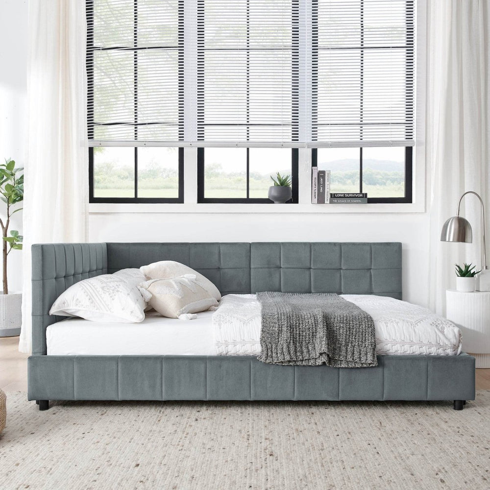 Full-size mid-century daybed upholstered in soft grey velvet with foam cushioning, featuring a backrest and armrest for comfort and versatility. Crafted with sturdy eucalyptus wood and composite frame, it supports up to 500 lbs, ideal for bedroom or living room seating without box spring.