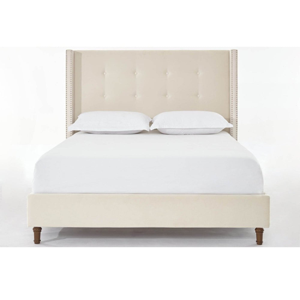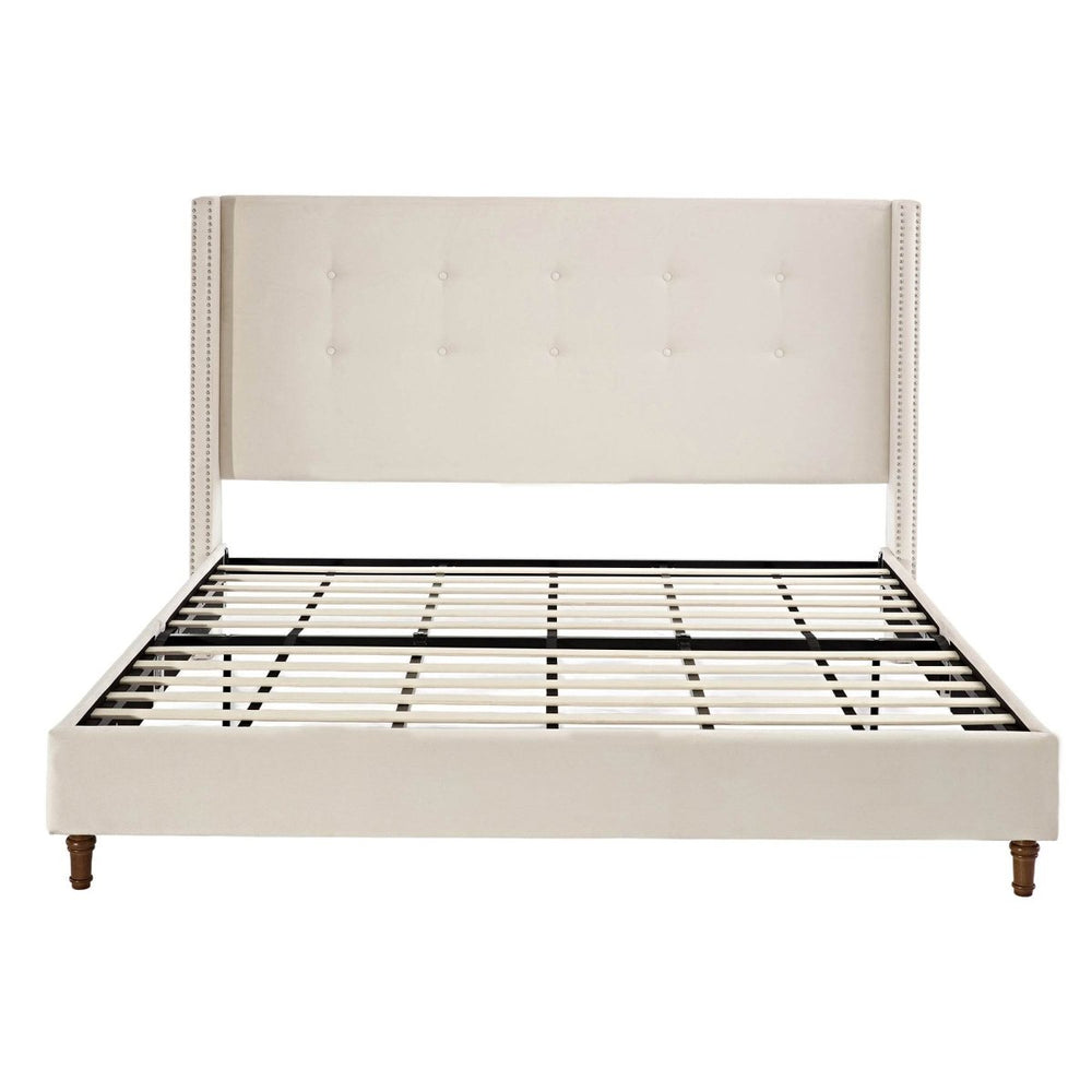 Ivory velvet upholstered bed frame features a 54-inch tall headboard with nailhead trim wingback and hand-buttoned tufting for classic European style. Its sturdy metal frame and wooden slats support mattresses without a box spring, offering quiet, reliable support and easy assembly.
