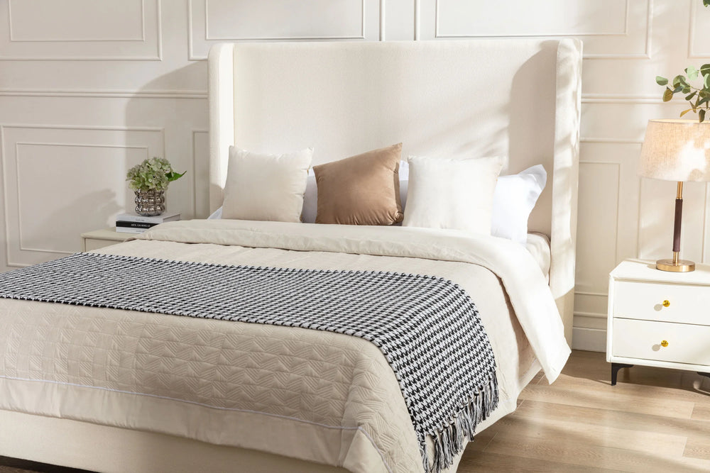 A towering headboard creates a serene and welcoming bedroom retreat