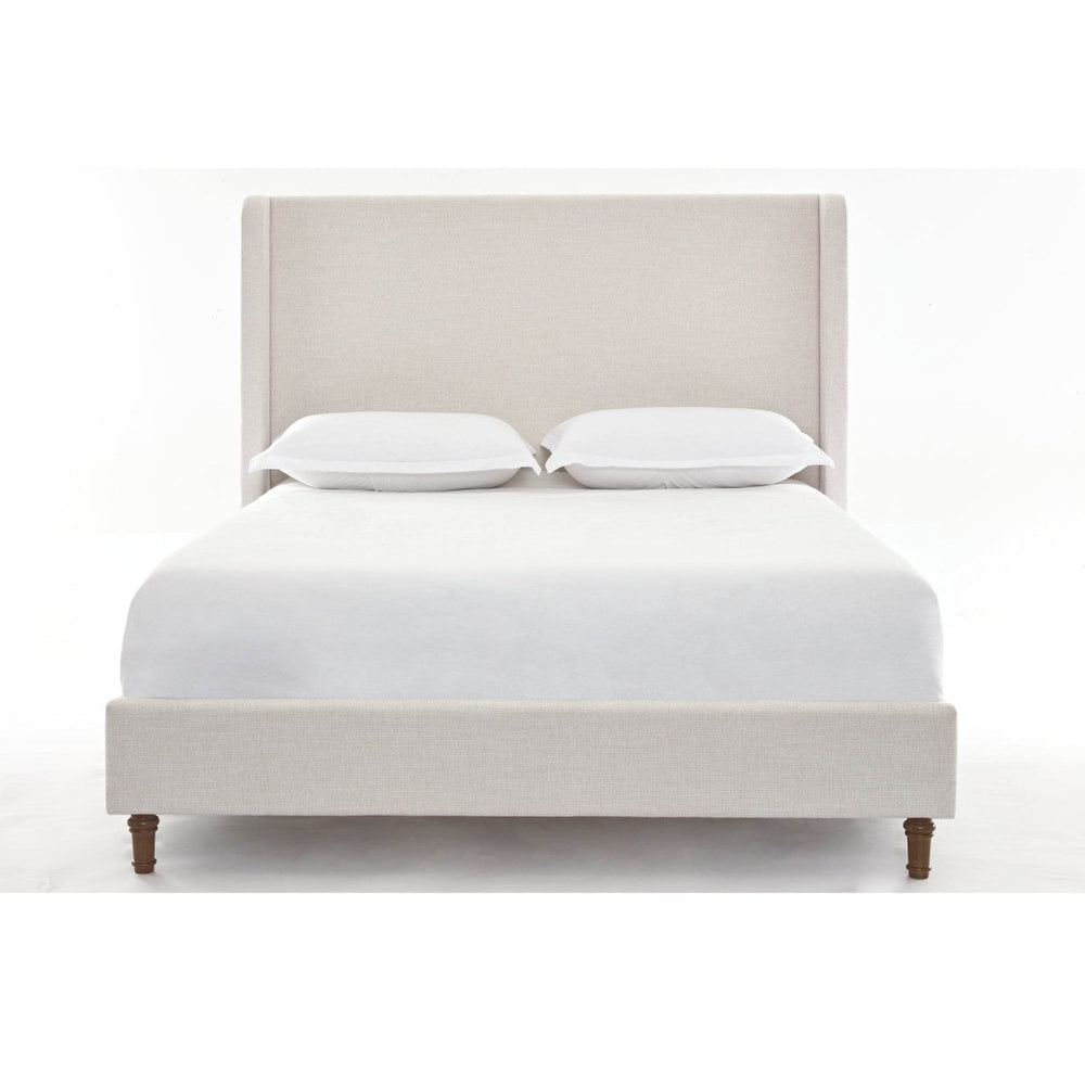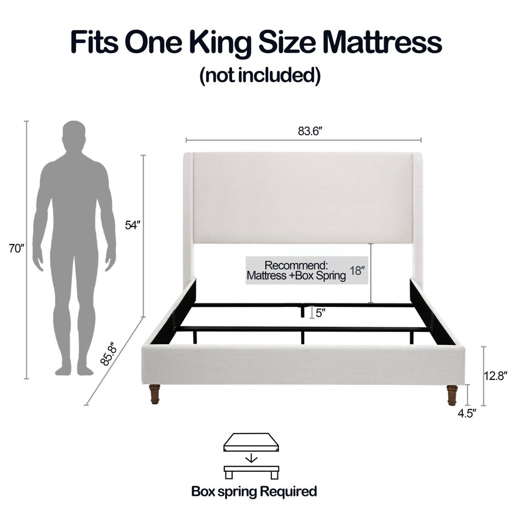 Contemporary king-size upholstered wingback bed frame features a 54-inch tall textured ivory chenille headboard, sturdy metal frame, and solid oak wood legs with walnut finish for enhanced bedroom comfort and elegant relaxation; box spring required.