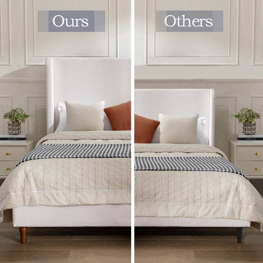 Elevate your bedroom with this stunning king size bed frame featuring a tall 54-inch wingback headboard wrapped in beautifully textured ivory chenille fabric. The soft curved wingbacks provide a cozy, inviting space to relax, while the sturdy metal frame and oak wood accents ensure lasting durability and stability. Its contemporary design combines elegant simplicity with solid walnut-finished wood feet, creating a perfect centerpiece that blends style and comfort. Designed to support your mattress with a recommended box spring for optimal height and comfort, this bed frame is easy to assemble with all tools included. Transform your sleep space into a sophisticated retreat and indulge in unmatched comfort every night. Elevate your relaxation today.