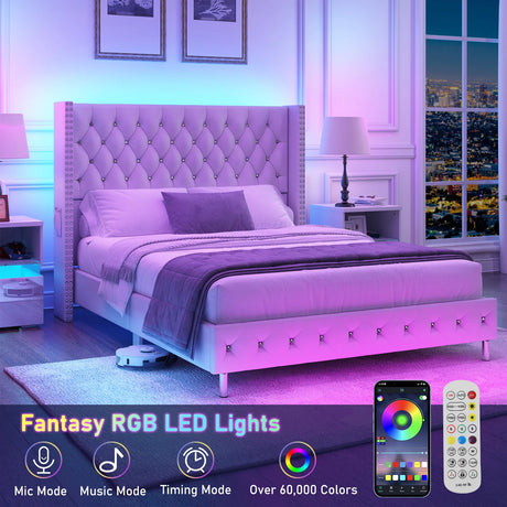 Queen Velvet Upholstered LED Wingback Bed Frame With USB Ports