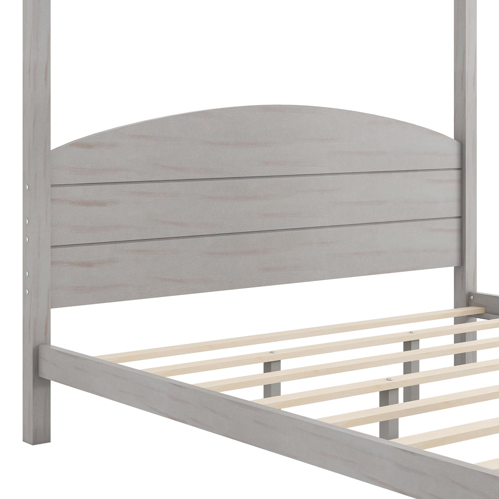Grey wash king size canopy platform bed features a sturdy pine wood frame with support legs for enhanced stability and side rails for durability. Its canopy design allows personalized styling and under-bed clearance offers space-saving storage. Assembly required.