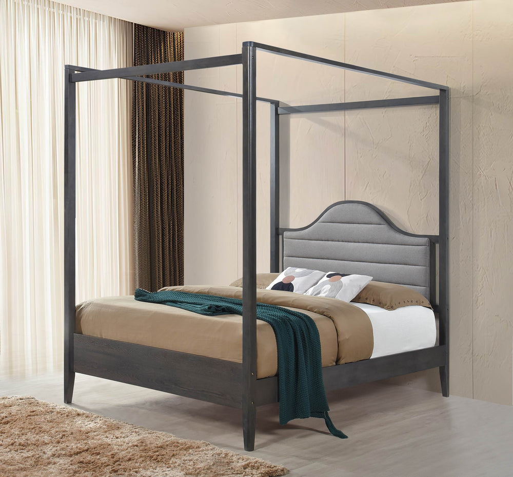 Wooden canopy queen bed features a wire brush brown finish with upholstered headboard, footboard, rails, and posts for sturdy support and classic style. Ideal for spacious bedrooms, it offers a comfortable foundation, simple assembly required, mattress sold separately.