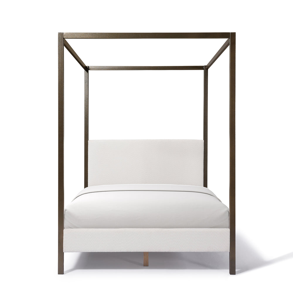 Industrial luxe canopy bed features a durable metal frame with boucle upholstery and foam padding for comfort. Its powder-coated finish offers wear resistance while the spacious design enhances bedroom style and restful sleep without requiring a box spring.