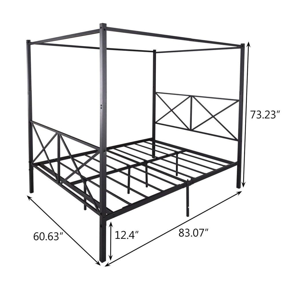Bring timeless European elegance to your bedroom with this deluxe metal canopy bed frame. Crafted from durable steel, the sturdy platform design supports up to 500 pounds, ensuring a stable foundation for your queen mattress without the need for a box spring. The striking black finish and X-shaped frame add a touch of vintage charm while complementing any décor style. With over 12 inches of under-bed clearance, you gain valuable storage space for shoes, boxes, or seasonal items, helping to keep your room organized and clutter-free. Easy to assemble with included tools and clear instructions, this noise-free bed frame offers a quiet, shake-resistant sleep environment. Transform your sleep space effortlessly—upgrade your comfort and style today.