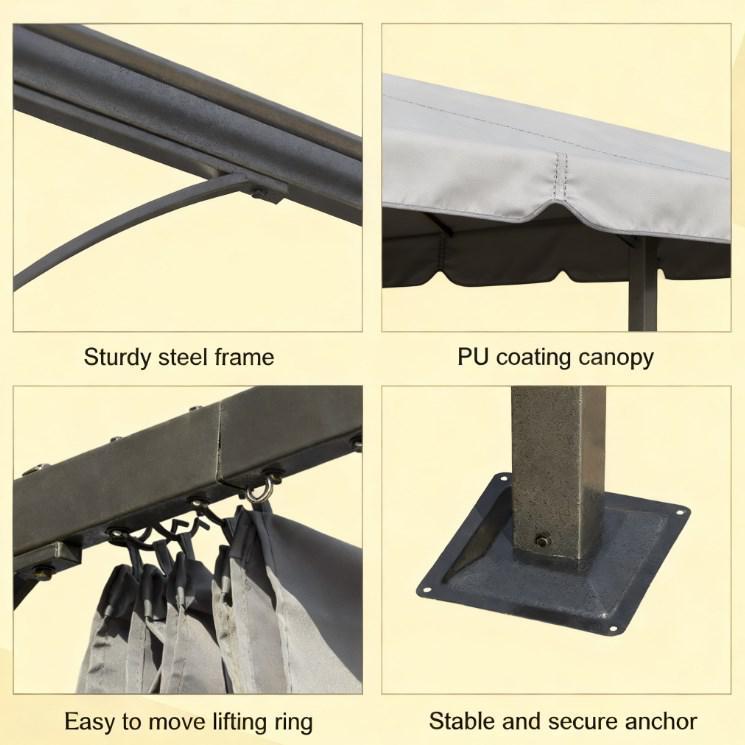 Outdoor retractable pergola canopy features a rust-resistant powder-coated steel frame and PU-coated polyester canopy with UV protection and water drainage. Adjustable sunshade offers customizable comfort, ideal for patios, decks, and gardens needing reliable sun and rain shelter.