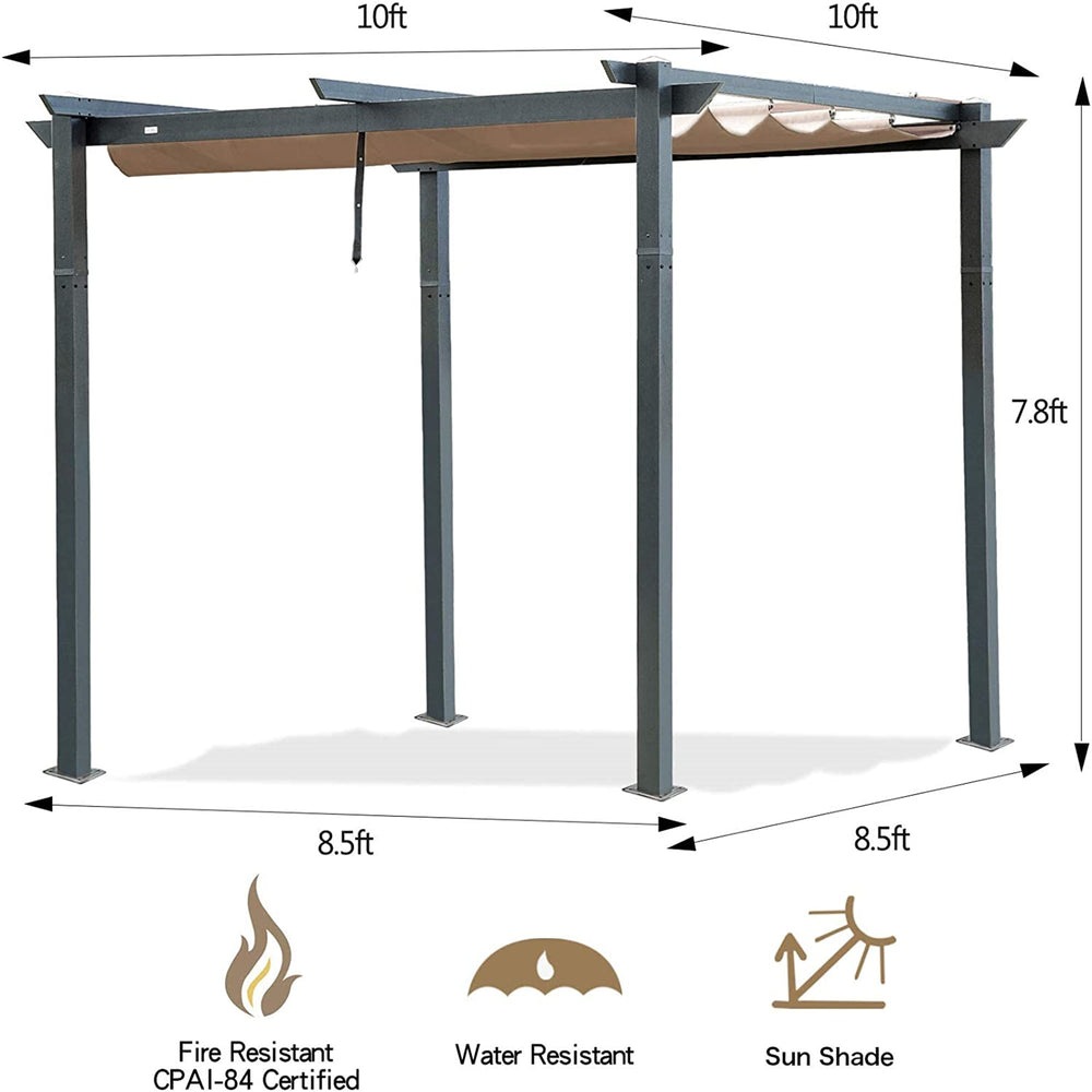 Transform your courtyard or patio into a stylish and functional retreat with this outdoor retractable pergola. Crafted from lightweight yet durable powder-coated aluminum, it offers superior resistance to rust, fading, and corrosion, ensuring long-lasting beauty and stability. The 10-foot by 10-foot (120 inch by 120 inch) frame supports a premium waterproof, UV-resistant polyester canopy with PU coating, designed to shield you from sun, light rain, and harmful UV rays. Enjoy full control of sunlight exposure thanks to the smooth retractable pulley system, allowing you to customize your shade throughout the day. Equipped with a smart magnetic locking system and reinforced straps, this pergola remains secure even on windy days. Perfectly sized for entertaining or relaxing, it complements any outdoor decor while providing a cool, shaded sanctuary. Elevate your backyard experience and create your ideal outdoor oasis today.