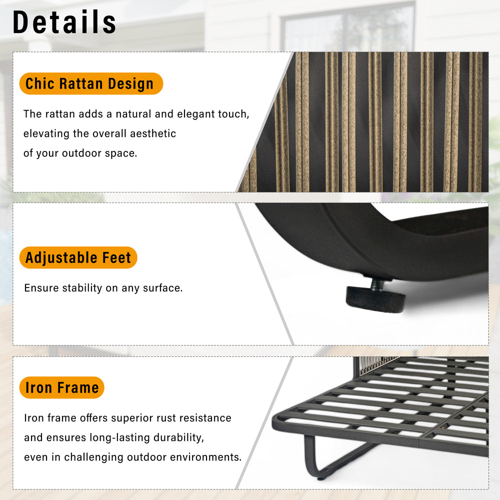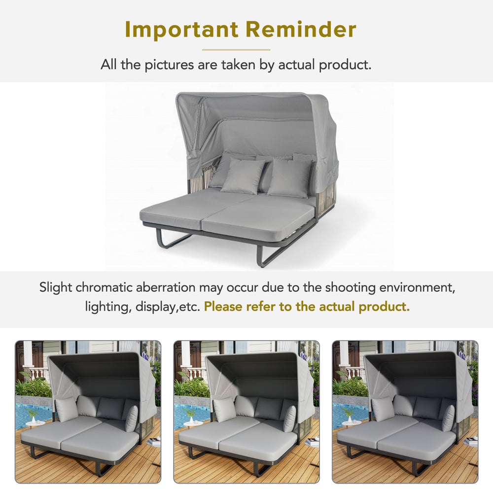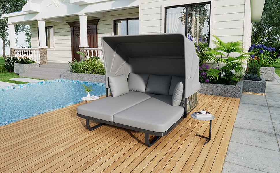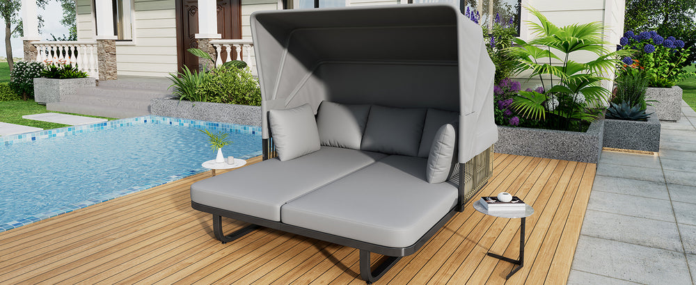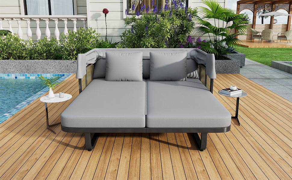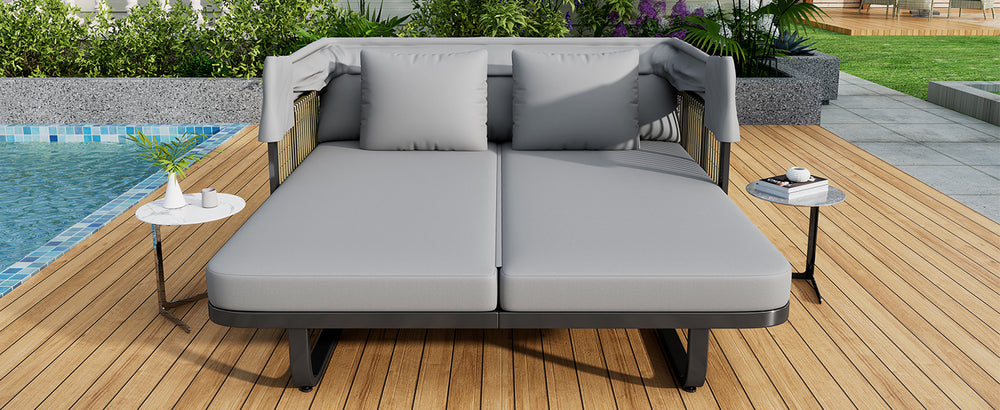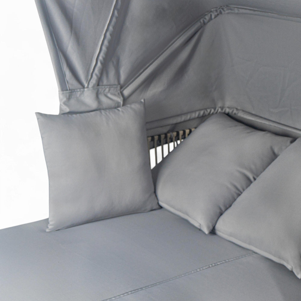 Unwind in style and comfort with this elegant Outdoor Patio Daybed, crafted for ultimate outdoor relaxation. Featuring a fully retractable sunshade canopy, you can effortlessly control your sun exposure, whether soaking up rays or enjoying cool shade. The robust powder-coated iron frame ensures long-lasting durability and rust resistance, while chic grey rattan side panels add a modern, natural touch to your patio or garden. Plush, high-density foam cushions wrapped in water-repellent, UV-resistant fabric promise soft, supportive seating that maintains its shape and appearance despite exposure to the elements. Removable cushions and pillows make cleaning simple, keeping your daybed fresh and inviting. Measuring approximately 57 inches long by 59.5 inches wide and 57.5 inches high, this stylish sectional seating group is the perfect centerpiece for outdoor lounging. Elevate your outdoor living space today with this versatile, durable, and comfortable patio daybed.