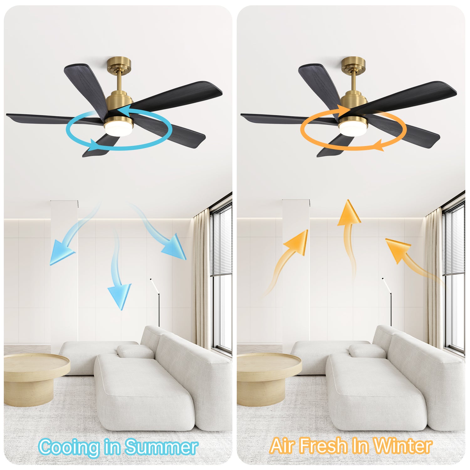 Experience efficient airflow and elegant style with this 52-inch ceiling fan featuring five solid wood blades and a sleek gold metal body. Equipped with a powerful, energy-saving reversible DC motor, it effortlessly cools your space in summer and circulates warm air in winter. The integrated dimmable LED light offers customizable illumination with three color temperatures (3000K/4000K/6000K), enhancing any room's ambiance. Control fan speed, lighting, and timer settings easily using the included smart remote, making comfort convenient at your fingertips. Its minimalist design with black solid wood blades adds a sophisticated touch to farmhouse, rustic, or modern interiors. Perfect for medium to large rooms and versatile enough for indoor patios and living spaces, this ceiling fan combines function and refined craftsmanship to elevate your environment. Upgrade your home comfort and style today.