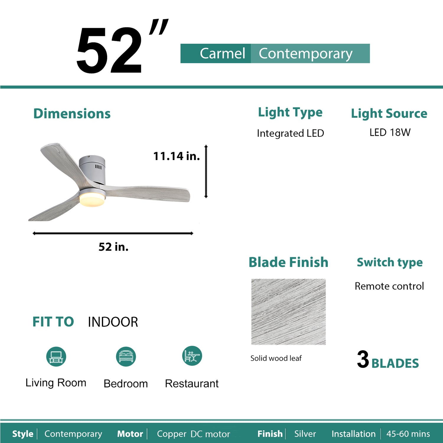 Upgrade your living space with this 52-inch ceiling fan, featuring three solid wood blades that bring timeless style and durability to any room. The ultra-quiet DC motor operates at under 35 decibels, providing powerful airflow without disturbing your peace. Its reversible blade design ensures optimal air circulation throughout the year, keeping you cool in summer and cozy in winter. The integrated 18W LED light offers customizable color temperatures (3000K, 4000K, 6000K) to brighten your room with energy-efficient illumination. With a sleek silver metal finish and gray woodgrain blades, this fan complements both modern and rustic décor. Perfect for bedrooms, living rooms, covered patios, and more, the low-profile flush mount installation adds a refined touch without overwhelming your space. Control fan speed, lighting, and timer settings effortlessly with the included remote for ultimate convenience. Elevate your comfort and style today.