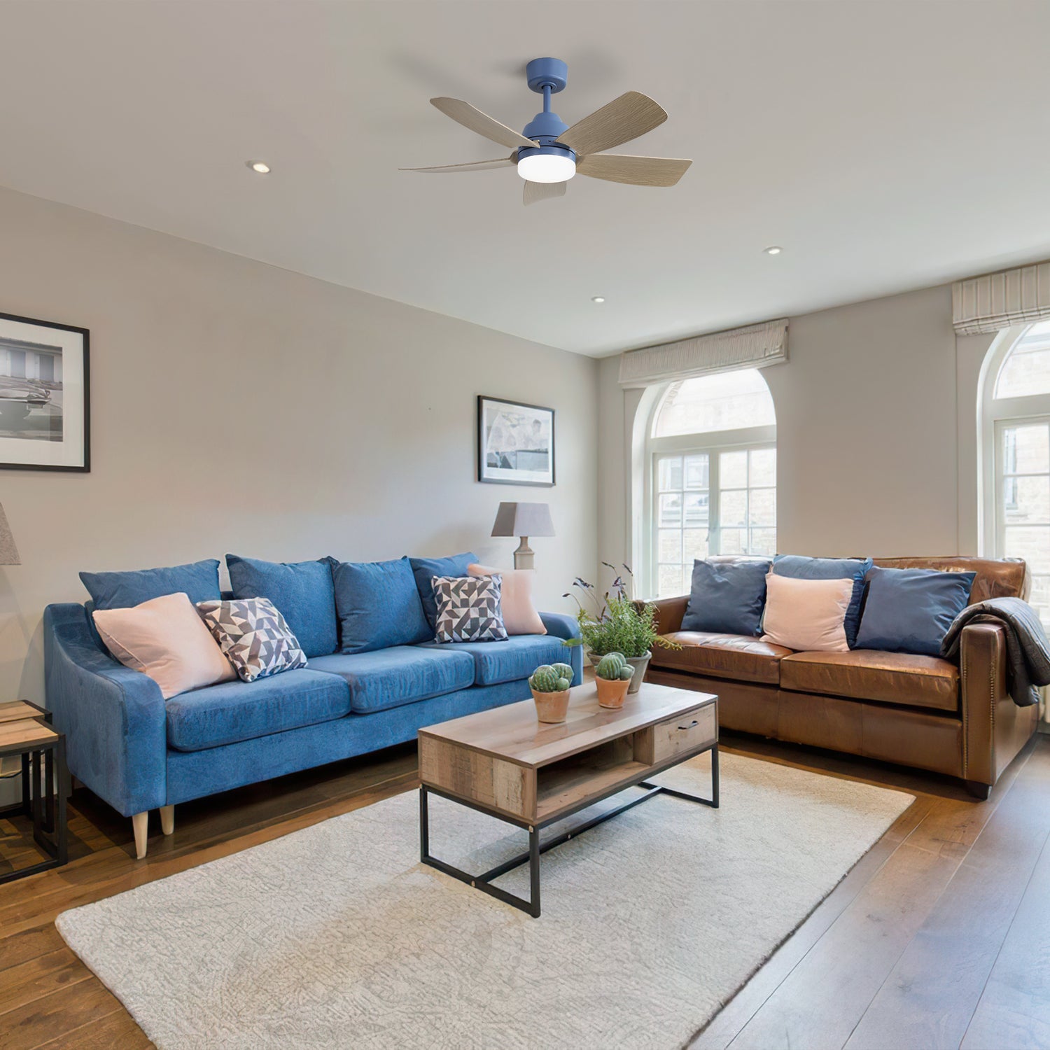 Upgrade your living space with this modern 42-inch ceiling fan featuring a sleek dark blue body and ABS gray wood grain blades. Powered by an energy-efficient DC motor, it delivers powerful yet quiet airflow to keep your room comfortable year-round. The reversible motor allows for cooling in summer and gentle warmth circulation in winter, making it perfect for bedrooms, living rooms, dining rooms, and offices. The integrated 22W dimmable LED light offers three color temperatures—warm, daylight, and cool light—adjustable to suit any mood or task. Control fan speed and lighting effortlessly with the included remote and convenient wall dock. Stylish, versatile, and quiet, this ceiling fan adds both function and flair to your home. Elevate your comfort and ambiance today.
