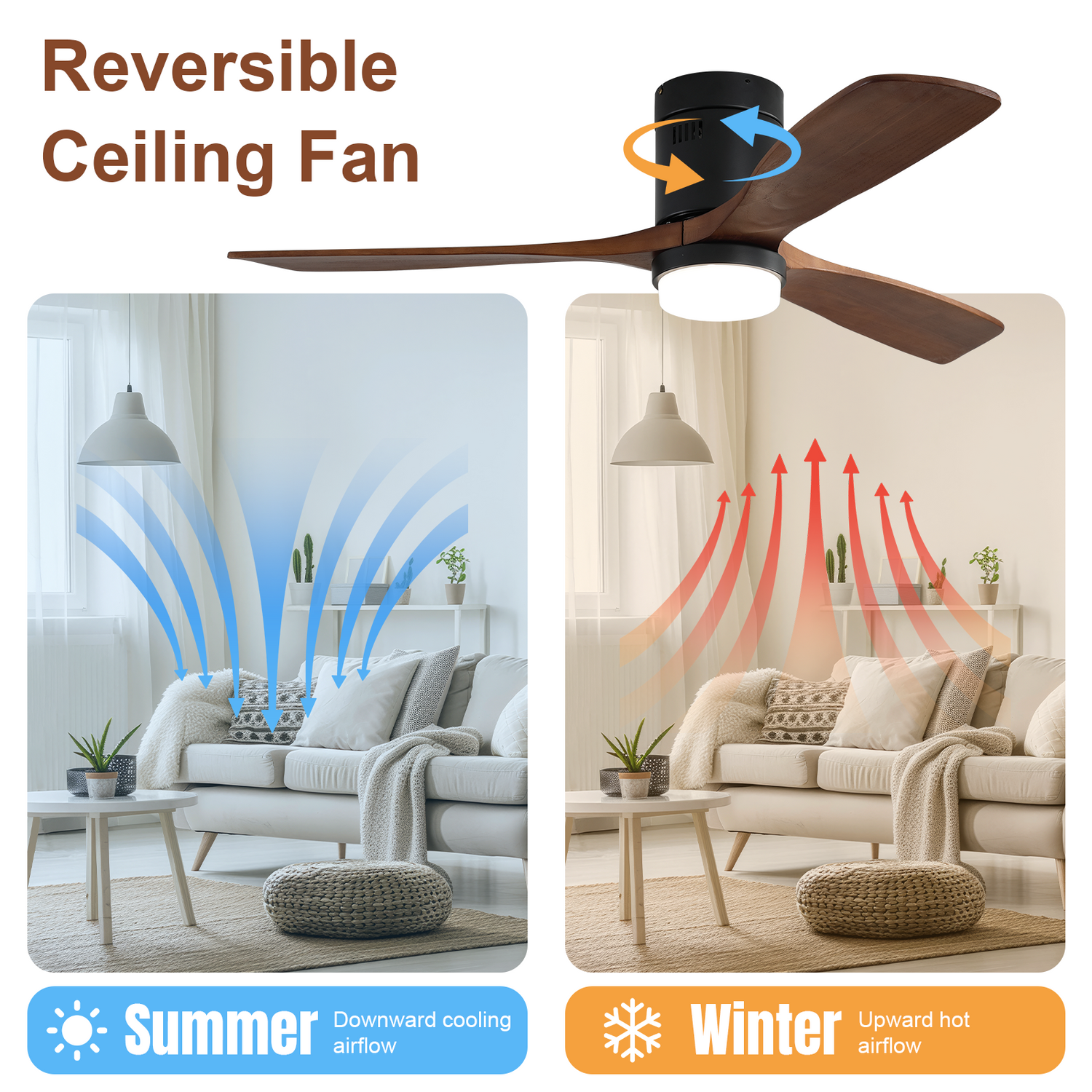 Enhance your living space with this modern 52-inch ceiling fan featuring three solid walnut wood blades and integrated LED lighting. Designed for both style and function, its ultra-quiet DC motor delivers powerful airflow with less than 35 decibels of noise, ensuring a peaceful environment whether you’re relaxing or working. The remote control lets you adjust six wind speeds, set timers, and reverse the blade direction for year-round comfort. Its sleek flush mount design and warm-to-cool light options (3000K, 4000K, 6000K) make it an elegant yet practical addition to bedrooms, living rooms, patios, and offices. Crafted with durable metal and wood materials, this fan offers effortless style that complements various décor styles while providing efficient cooling and illumination. Elevate your indoor comfort and ambiance today.