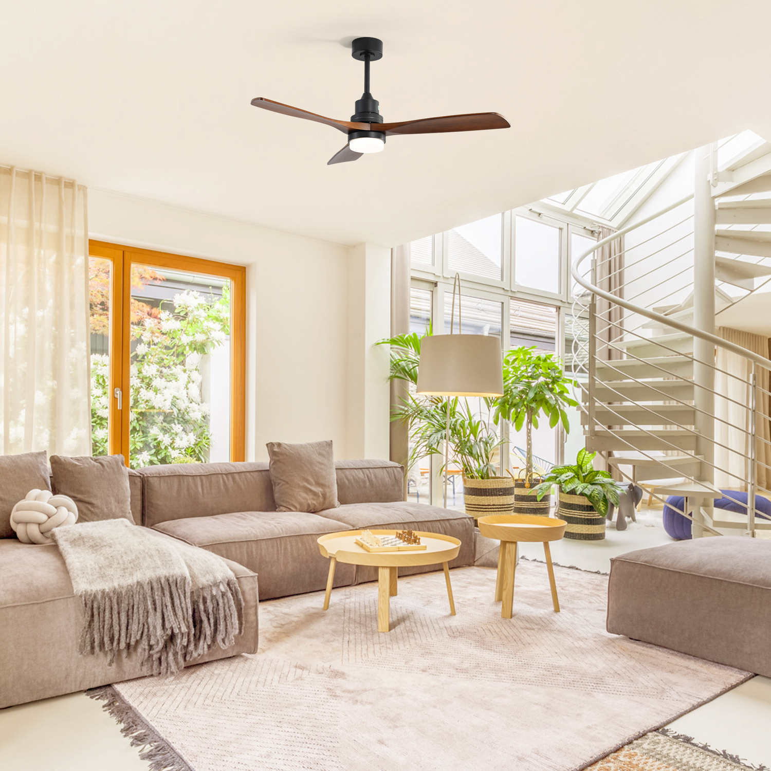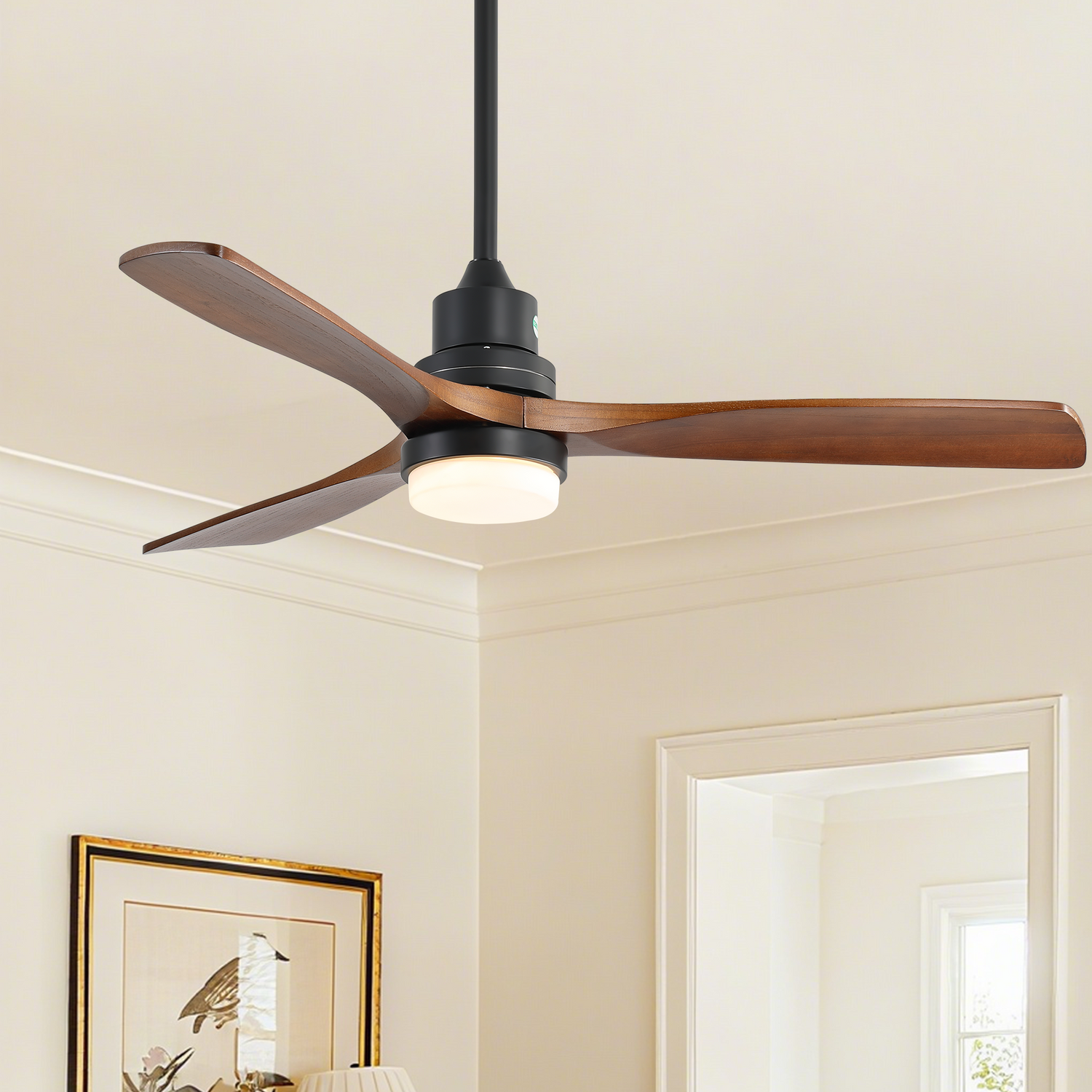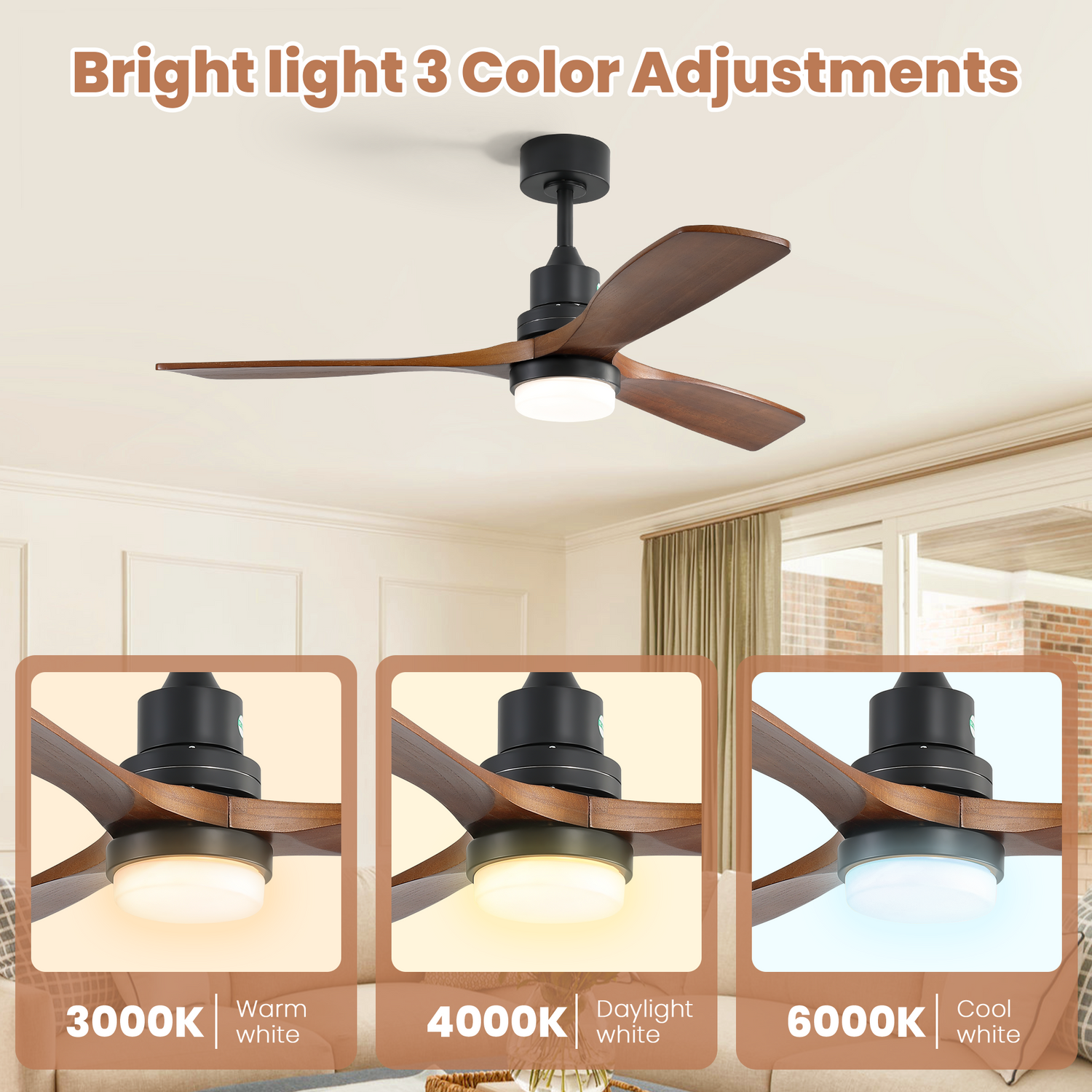 This 52-inch ceiling fan features energy-efficient ultra-quiet DC motor with reversible walnut wood blades, remote control with 6 speeds, and an adjustable 3-color LED light, providing powerful airflow and ambient lighting ideal for medium to large indoor and covered outdoor spaces.