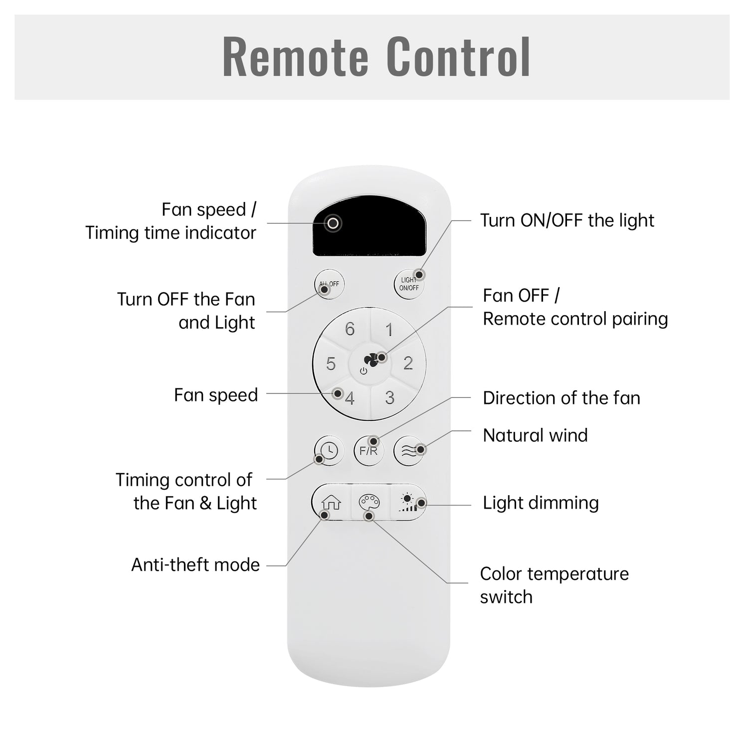 42-inch ceiling fan with dimmable 22W LED light and remote control offers quiet, energy-efficient airflow with reversible DC motor for year-round comfort. Features adjustable brightness, three light colors, and timer, ideal for bedrooms and living spaces.