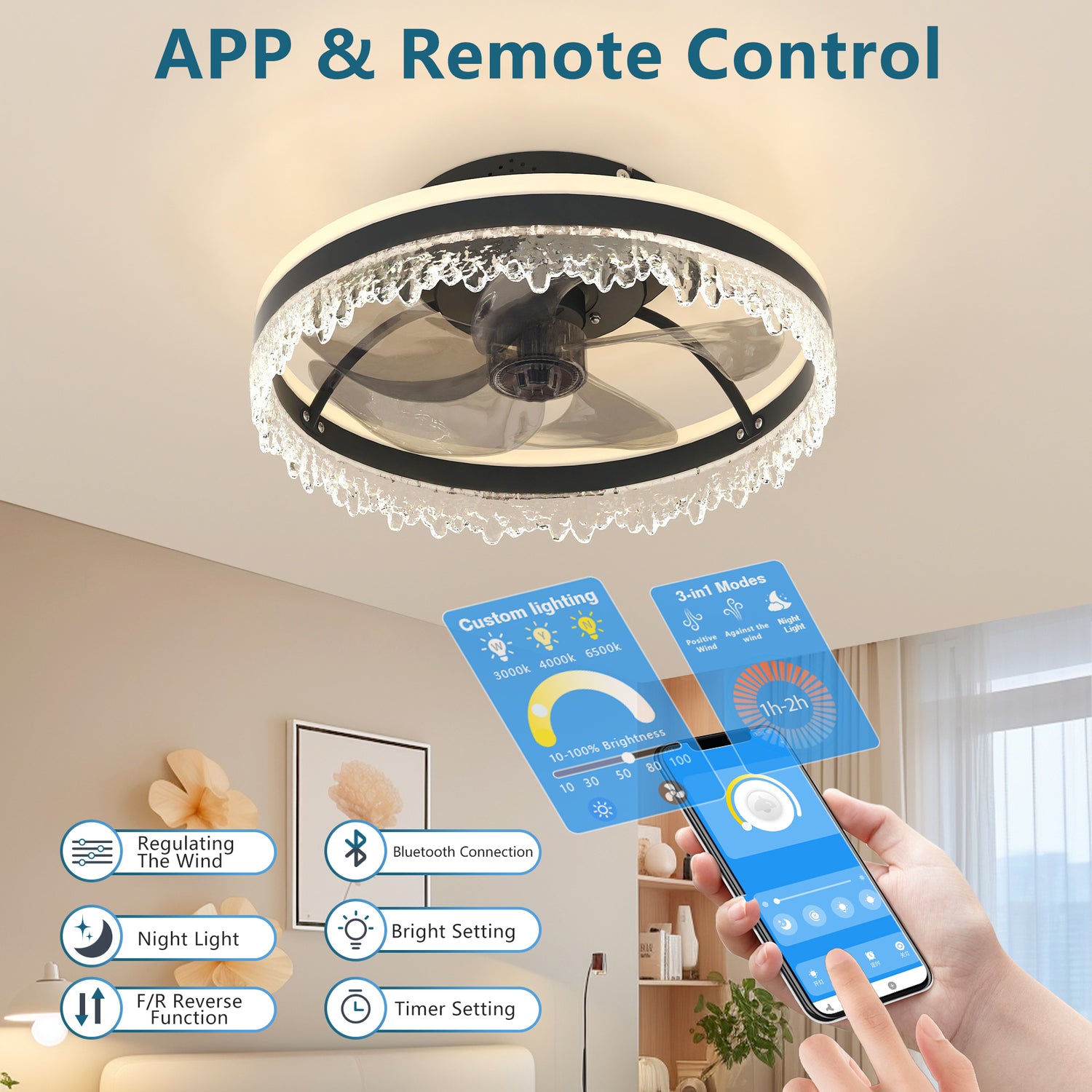 Enhance your living or bedroom space with this sleek 16-inch ceiling fan that combines contemporary design with powerful functionality. Featuring invisible fan blades and a crystal-inspired edge, this fixture adds a sophisticated touch while delivering quiet, efficient airflow. The dimmable LED light allows you to customize brightness and adjust color temperature from warm to cool white, creating the perfect ambiance for any occasion. Controlled effortlessly via remote or app, this ceiling fan offers convenient speed and lighting adjustments plus a timer function for energy-saving comfort. Built from durable iron in classic black, it mounts easily to complement your modern décor and provide year-round comfort. Elevate your home environment with this innovative fan and lighting solution today.