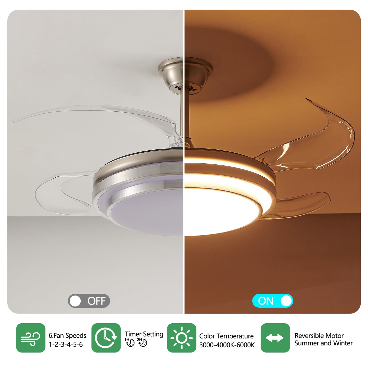 Modern 42-inch ceiling fan features retractable blades for enhanced air circulation and space-saving design, six adjustable wind speeds, and soft LED lighting with remote control. Its quiet DC motor suits bedrooms and living rooms, blending style with versatile comfort and lighting.