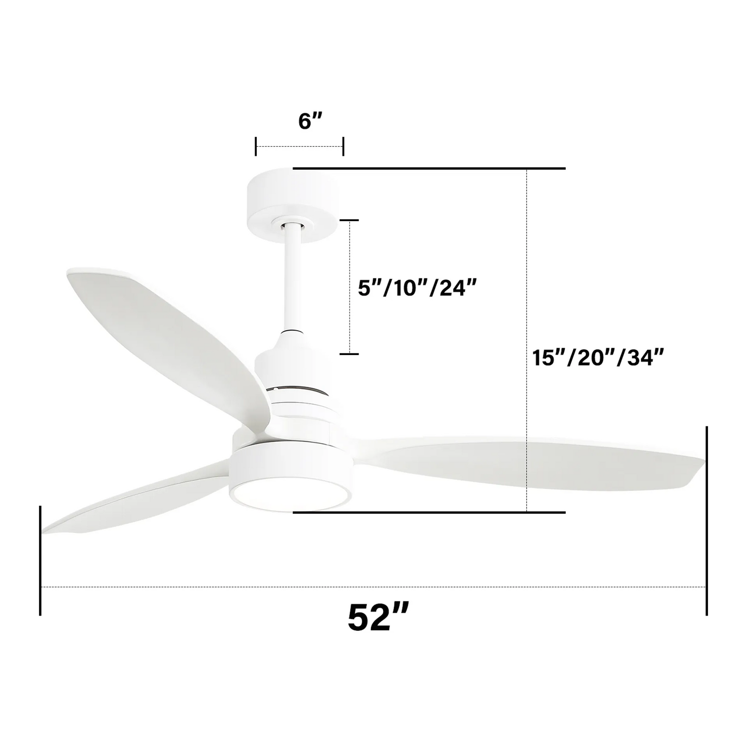 Stay cool and stylish with this 52-inch ceiling fan featuring three solid wood blades in a matte white finish. Equipped with an energy-efficient DC motor, it operates quietly while using 65% less energy than traditional fans—perfect for bedrooms, living rooms, offices, and more. The reversible airflow function lets you switch between cooling summer breezes and upward winter circulation, helping reduce energy costs year-round. Control the fan speed effortlessly using the included remote with convenient wall docking. An integrated 18W LED light with three color temperatures (3000K/4000K/6000K) brightens your space with energy-saving, long-lasting illumination. Combining metal durability with wooden elegance, this fan adds a timeless touch to any modern or vintage-inspired decor. Elevate your indoor climate control and lighting today.