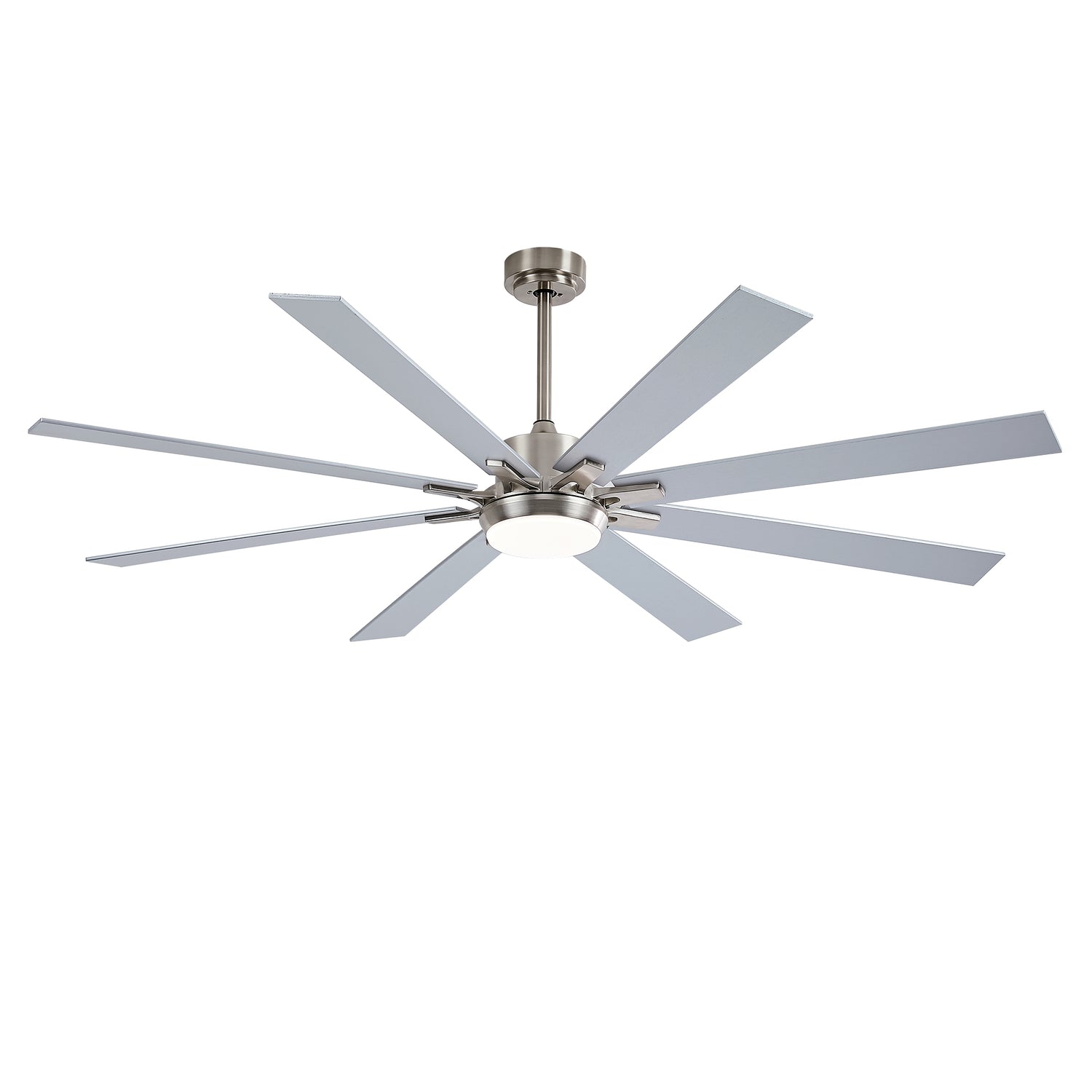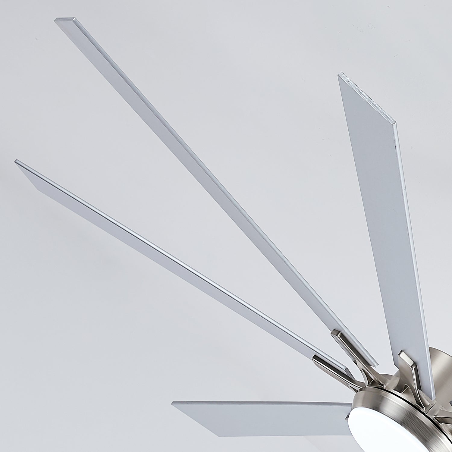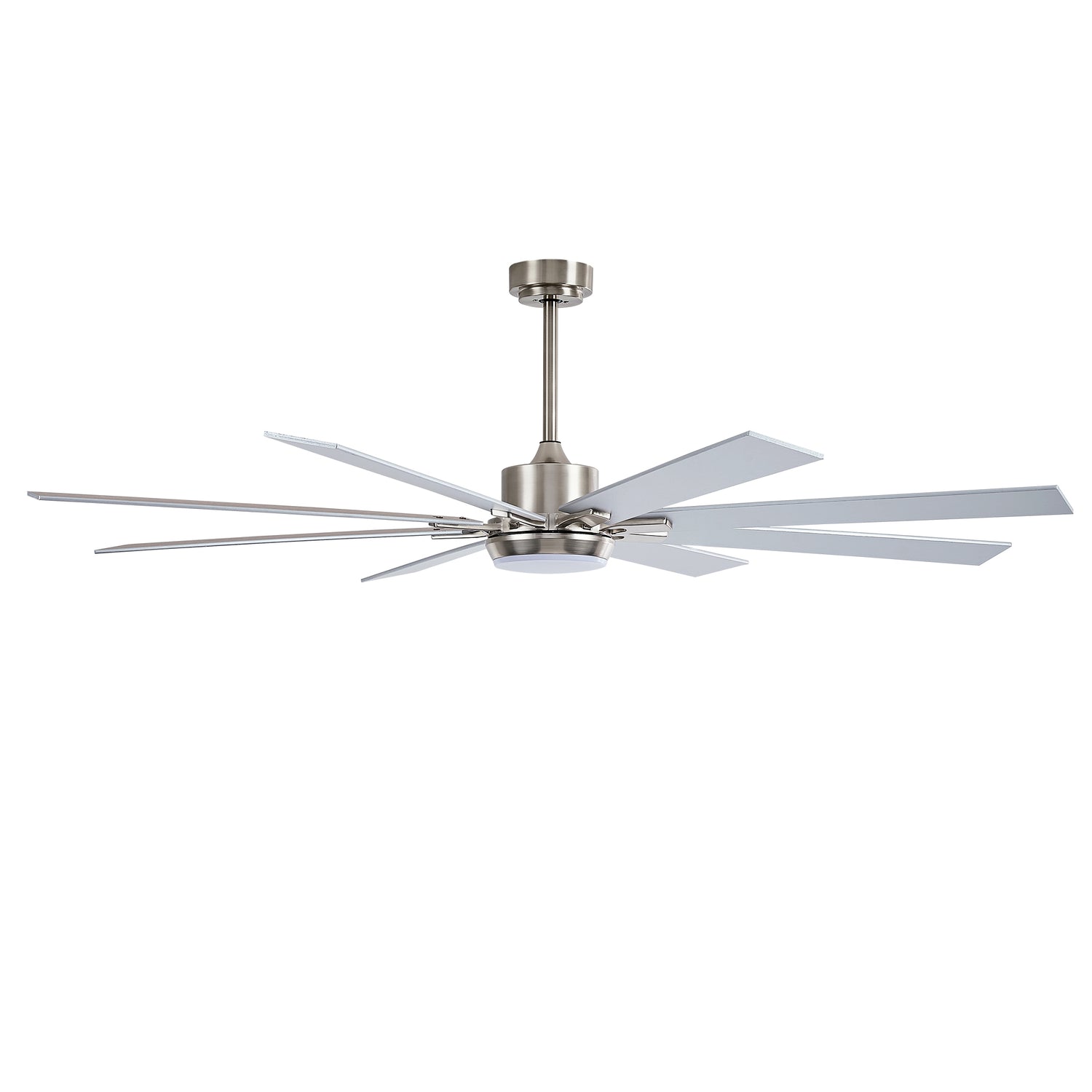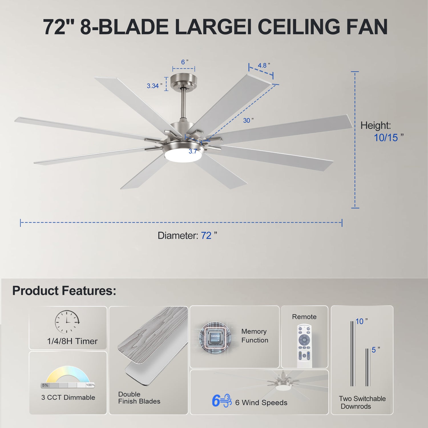 This 72-inch ceiling fan features eight plywood reversible blades inspired by airplane propellers, offering powerful, even airflow with a quiet, energy-efficient DC motor. It includes a dimmable 15W LED light and supports remote and wall switch control, ideal for indoor and covered outdoor spaces.