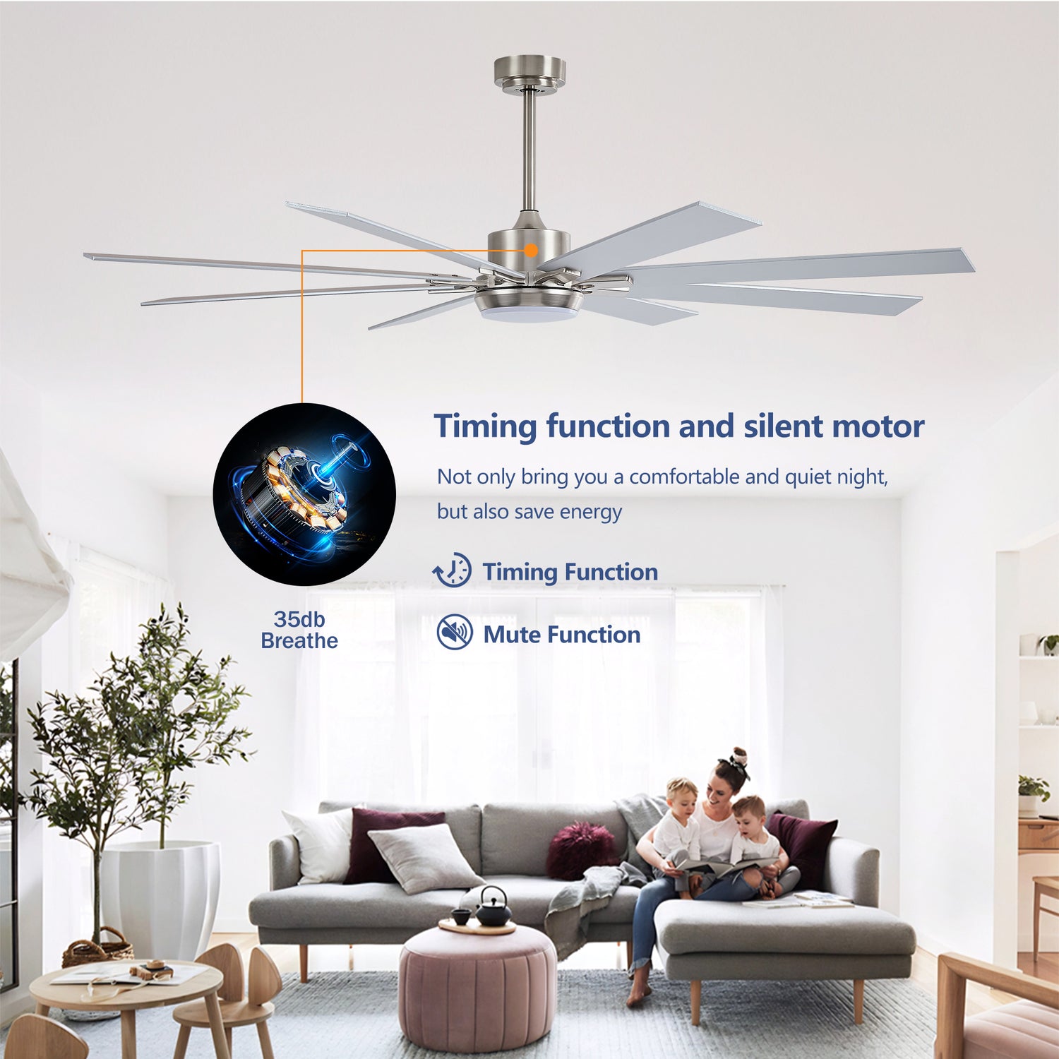 Experience powerful and quiet airflow with this 72-inch ceiling fan, designed to seamlessly blend American Traditional, Industrial, and Modern styles. Inspired by airplane propellers, its 8-piece reversible plywood blades maximize air circulation for a refreshing environment in your living room, bedroom, office, or covered patio. The integrated 15W dimmable LED light offers customizable illumination with three color settings, perfect for creating the ideal ambiance. Equipped with an energy-efficient reversible DC motor, this fan ensures year-round comfort by cooling in summer and distributing warmth in winter. Control speeds, lighting, and timer settings effortlessly via remote or wall switch. The fan’s simple installation works even on ceilings angled up to 15°, making it a versatile and stylish addition to any indoor space. Elevate your home comfort today with this modern ceiling fan and light kit combination.