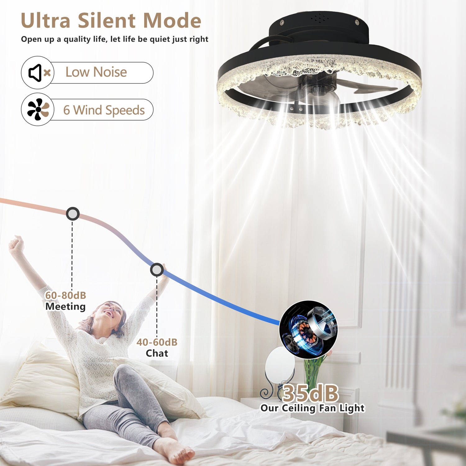 This modern ceiling fan light combines efficient airflow with dimmable LED lighting and a decorative crystal-inspired acrylic ring. Featuring hidden blades and whisper-quiet operation with remote and app control, it’s ideal for stylish low-ceiling bedrooms and living areas.