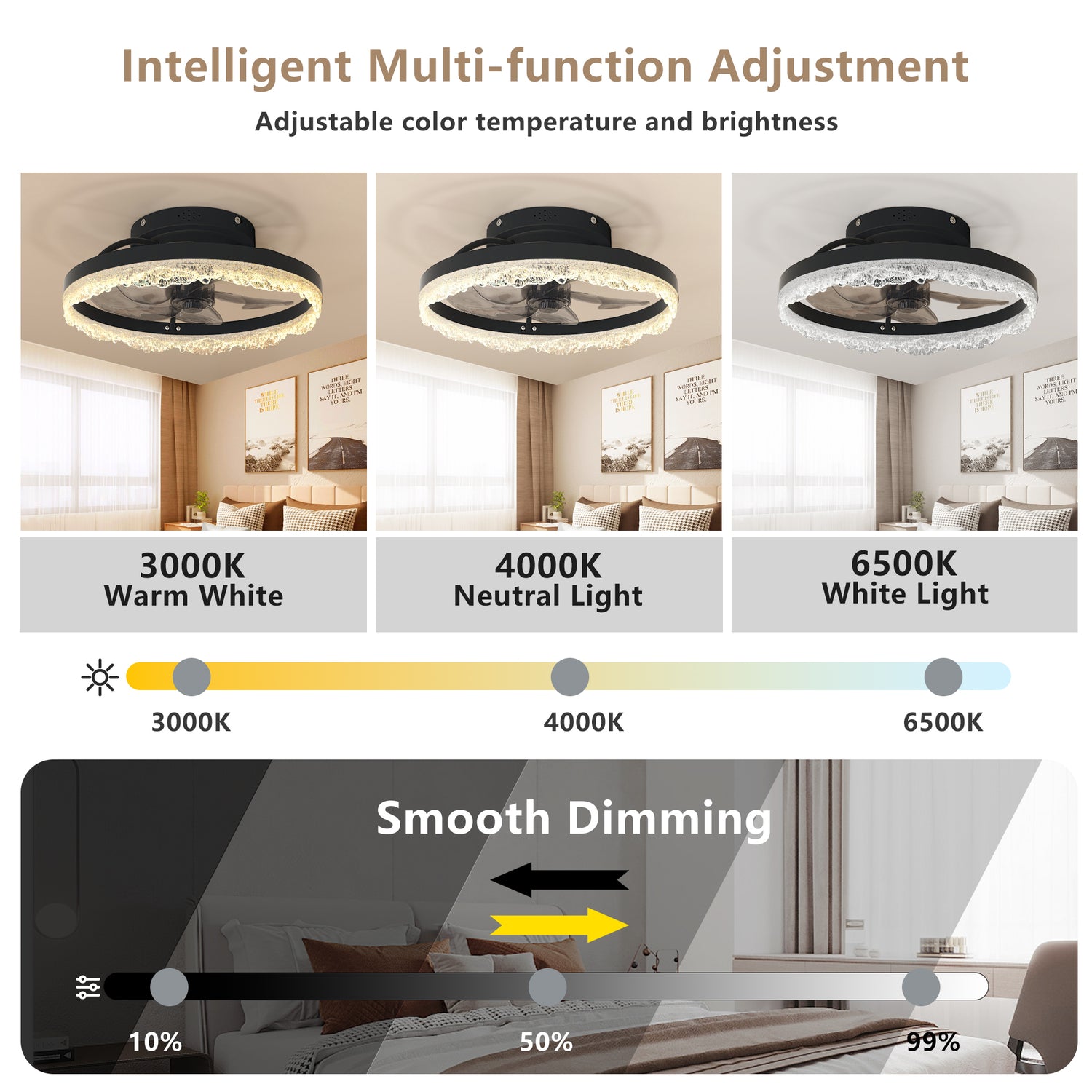 Combine style and function effortlessly with this modern flush mount ceiling fan light. Featuring a stunning crystal-inspired frosted acrylic ring, it delivers a soft, ambient glow that elevates any room’s atmosphere. The hidden blades provide powerful yet silent airflow, maintaining a sleek, minimalist look without bulky fan blades in sight. Equipped with remote and app controls, adjust fan speed and dim the energy-efficient LED light ranging from warm to cool tones (3000K-6500K) to suit your mood. Ideal for spaces with low ceilings, this iron-built fan light measures just 15.7 inches wide and 5.1 inches high, blending seamlessly into bedrooms, living rooms, or offices. Its whisper-quiet operation ensures comfort without disruption. Elevate your living space today with this versatile decorative ceiling fan light that offers both illumination and cooling in one elegant fixture.