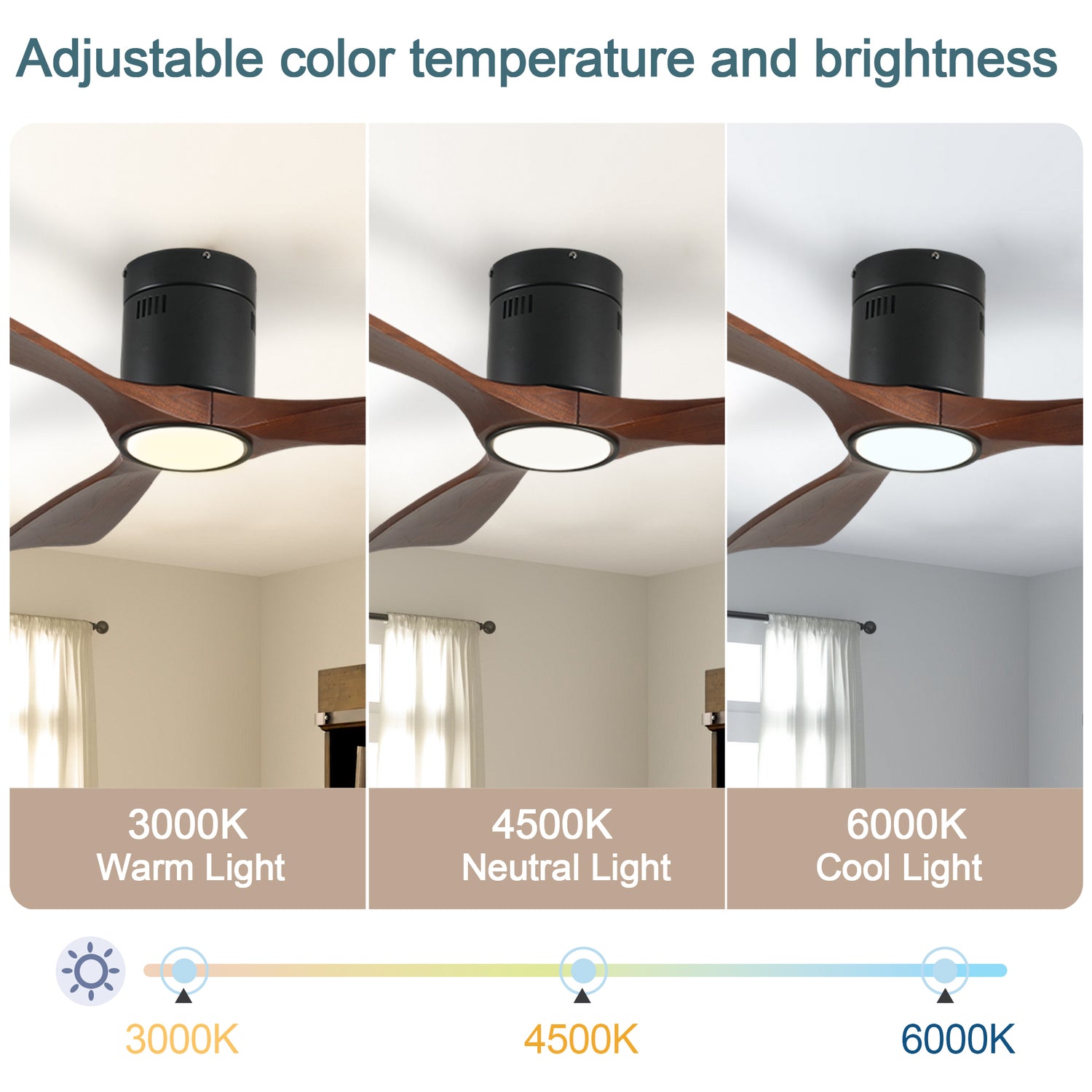 Experience year-round comfort and elegant design with this 52-inch ceiling fan featuring three solid wood blades finished in rich dark walnut and a sleek matte black metal housing. Equipped with a reversible DC motor, it efficiently circulates air downward to cool in summer and upward to redistribute warm air in winter, helping you save energy. The integrated 18W LED light offers adjustable brightness and color temperature from warm 3000K to bright 6000K, easily controlled and saved via the included remote. Six fan speeds and a timer function provide personalized airflow and convenience. Its low-profile flush-mount design blends vintage charm with modern farmhouse style, making it perfect for bedrooms, living rooms, dining rooms, and covered outdoor spaces. Elevate your home’s atmosphere and comfort today with this versatile ceiling fan and light combo.