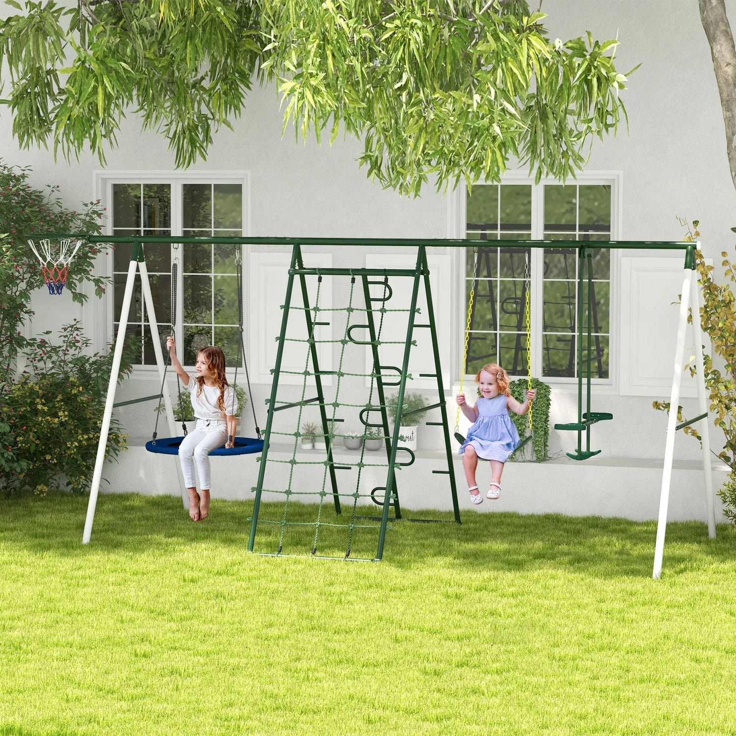 - Multi-Activity Playset: Includes saucer swing, slide, swing seats, glider, climbing steps, climbing net, and basketball hoop.