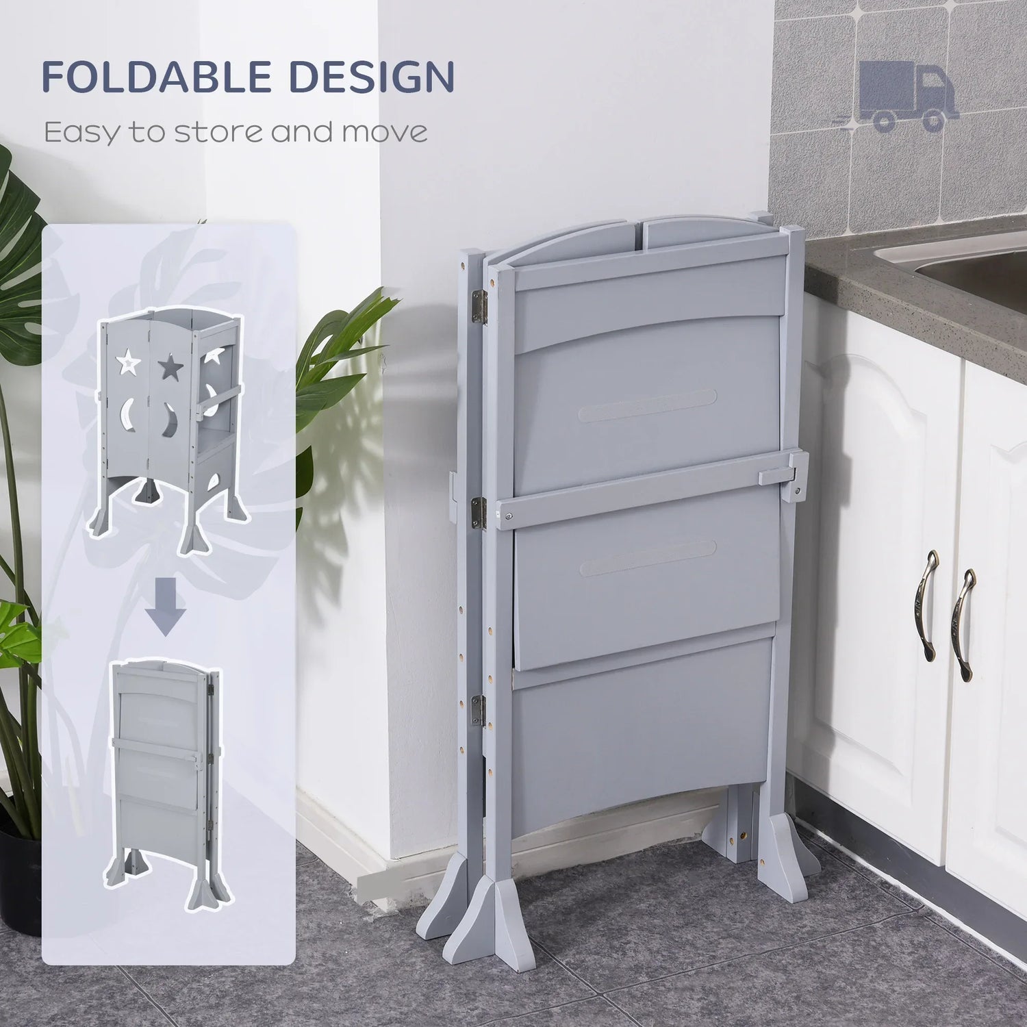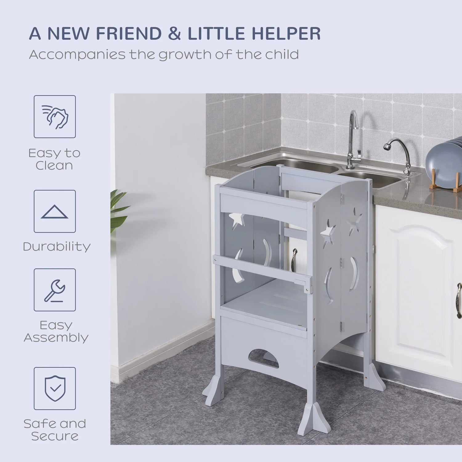 Designed to boost confidence and independence, this foldable toddler standing tower elevates your child safely to counter height. Crafted from sturdy MDF and finished in versatile gray, it’s perfect for little chefs eager to join cooking, baking, or kitchen cleanup. The thoughtfully designed four-sided safety rail provides secure support while the open middle prevents slipping, making it a stable and safe platform for kids aged 3 to 8. Its compact, foldable design allows easy storage when not in use, keeping your space tidy. With dimensions of 22 inches long by 22 inches wide and standing 36.5 inches tall, this helper stool offers a comfortable step size of 17.25 by 15 inches and a raised platform at 16.25 inches off the ground. Encourage hands-on learning and independence—elevate your child’s everyday activities safely and conveniently.