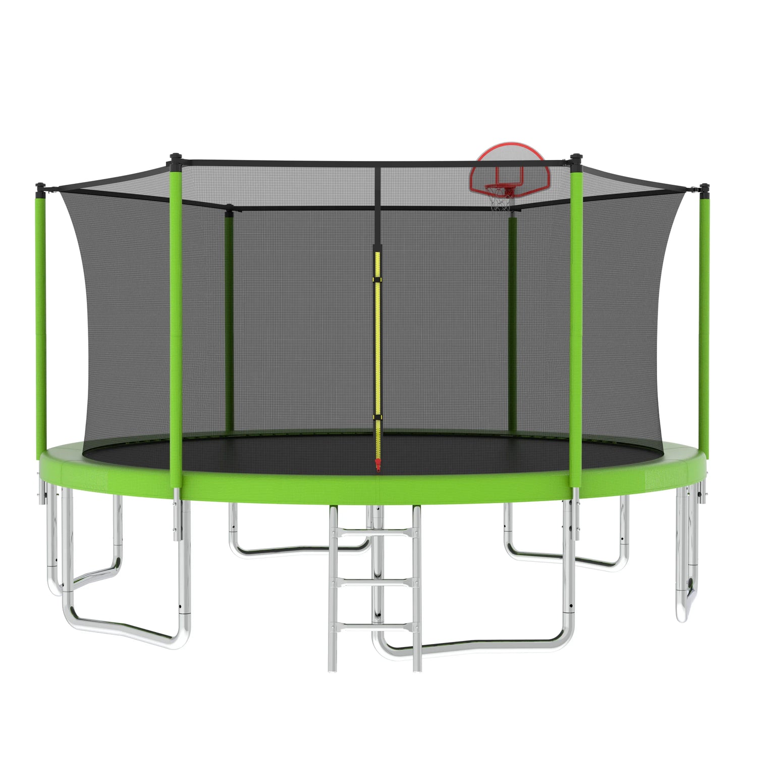 Give your children endless outdoor entertainment and exercise with this spacious 14-foot trampoline designed for backyards and recreational use. Crafted with a heavy gauge galvanized steel frame and reinforced with six W-shaped legs, it offers superior stability and durability. The 6 high safety enclosure poles, padded with foam and wrapped in UV-resistant PE netting, ensure maximum protection for active jumpers. Equipped with a convenient 3-step galvanized steel ladder and soft rebound springs, this trampoline combines fun with safety. All necessary accessories, including a basketball hoop, ball, pump, and hardware, come neatly packed for easy assembly. With compliance to ASTM safety standards and materials that pass rigorous UV tests, you can trust this trampoline to withstand outdoor elements while keeping your kids secure. Elevate your family’s playtime and outdoor enjoyment today!