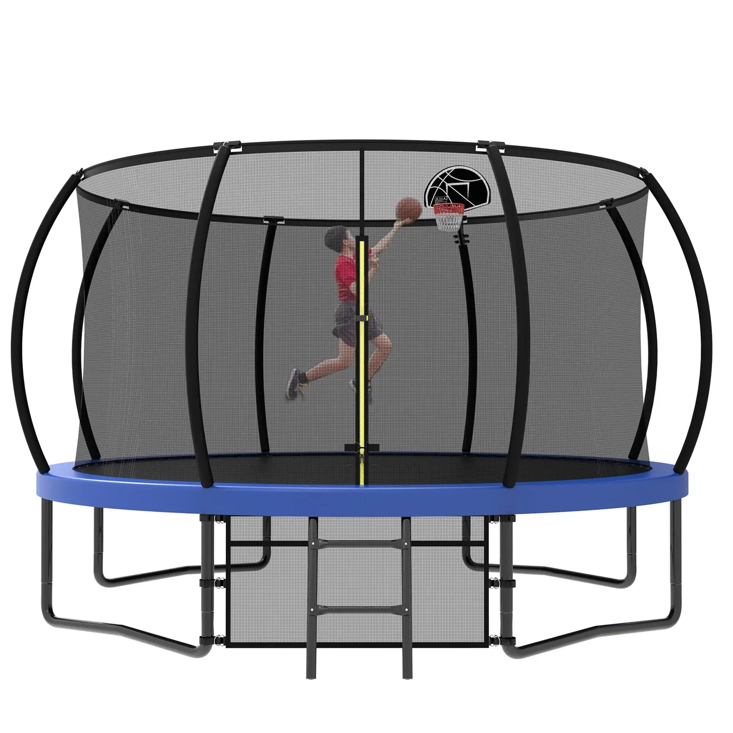 Bring excitement and active play to your backyard with this pumpkin-style 12-foot kids trampoline, crafted for safety and durability. Featuring a spacious jumping area with robust blue steel construction, it offers reliable support for energetic children. The trampoline includes a full 360-degree safety enclosure net with foam-padded poles, preventing accidental falls and collisions. Extra padding covers the springs for added protection, ensuring a worry-free bounce every time. Equipped with a convenient ladder, a durable storage bag, and even a basketball hoop for enhanced play value, this trampoline encourages outdoor fun while promoting physical fitness. Easy to assemble with clear instructions and snap-link parts, it’s designed for stress-free setup. Suitable for kids under adult supervision, with a single-user weight limit of 330 pounds, this trampoline is the perfect addition to any family’s active lifestyle. Elevate your child’s playtime safety and enjoyment today.