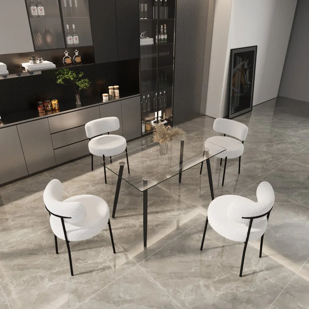 Bring contemporary style and functionality to your dining space with this elegant 51.2" x 27.5" dining table set. Featuring a sleek tempered glass tabletop paired with sturdy black metal legs, this set creates a bright, open feel perfect for modern homes. Four plush white Teddy velvet chairs offer exceptional comfort and a soft touch, making every meal a cozy occasion. Designed for smaller or stylish dining areas, this set balances durability with chic appeal, while anti-slip pads keep the table firmly in place. Whether dining, working, or entertaining, this versatile set adapts effortlessly to your lifestyle. Easy to assemble with included instructions and tools, it’s the perfect centerpiece to uplift your space. Upgrade your home with this stylish and practical dining solution today.