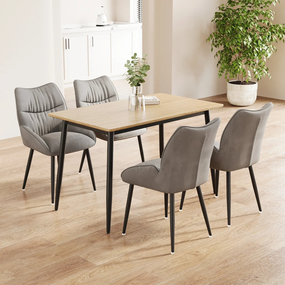 Bring style and functionality to your dining area with this modern minimalist 4-piece dining set. Featuring a sleek wood grain MDF tabletop paired with sturdy black metal legs, this set combines durability with contemporary design to fit seamlessly into any kitchen or dining room. The four velvety plush chairs offer soft, comfortable seating ideal for 4 to 6 people, making every meal a cozy and inviting experience. Easy to assemble within 15 minutes, this dining set saves you time without compromising quality. Its versatile aesthetic complements various interior styles, creating a warm and elegant atmosphere for family gatherings or casual dinners. Designed for easy cleaning and long-lasting use, this set is the perfect space-saving solution for apartments and homes alike. Elevate your space and enjoy meals in comfort and style today.