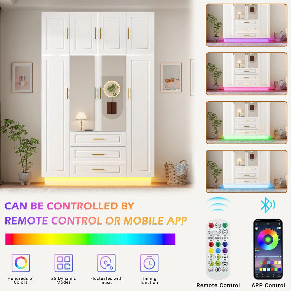QiaoShiRen minimalist modern 4-door LED armoire wardrobe features adjustable RGB lighting, a full-length hanging rod for wrinkle-free clothing, three smooth-glide drawers, and multiple shelves for versatile bedroom storage, ensuring a sturdy, noise-free, and stylish organization solution.