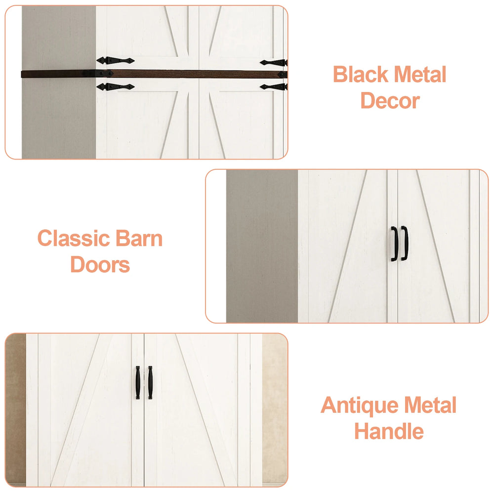 • Farmhouse Style: Distressed antique finish with barn door design creates a warm, rustic ambiance.