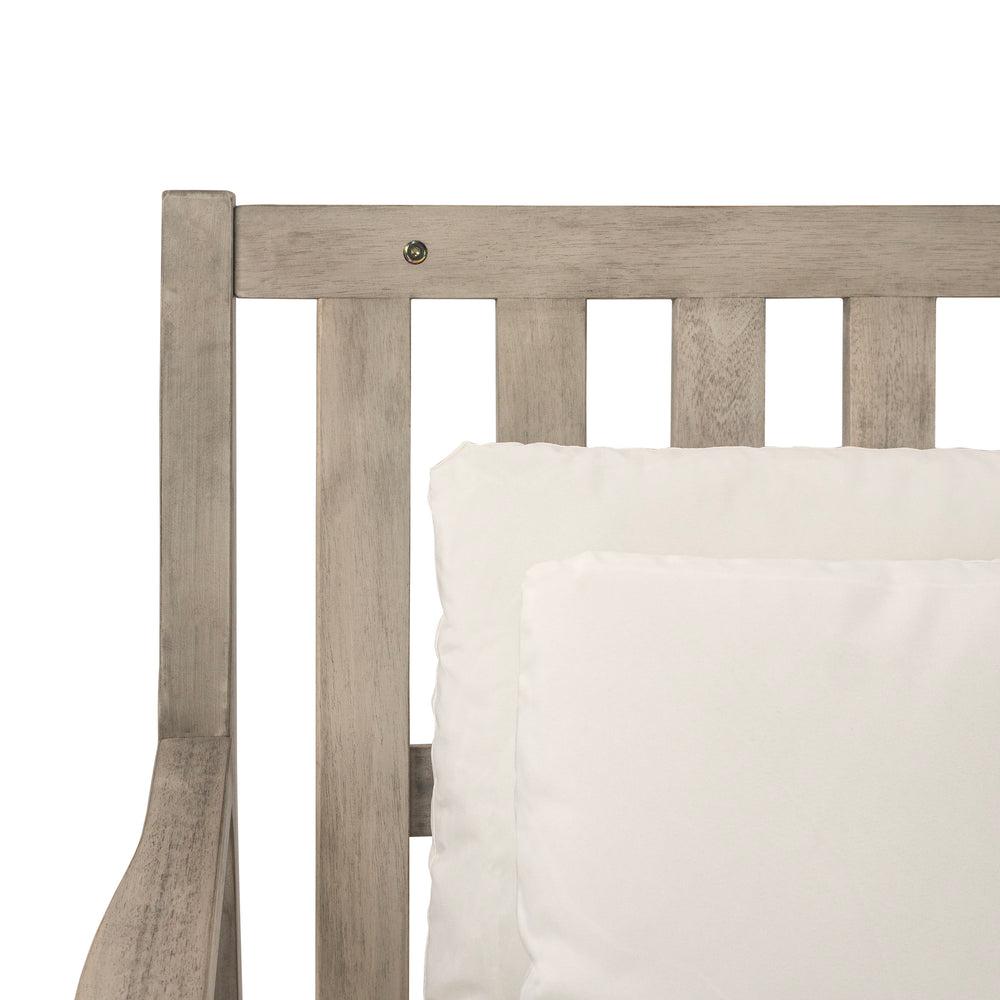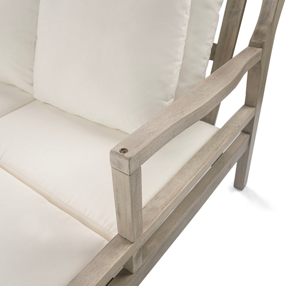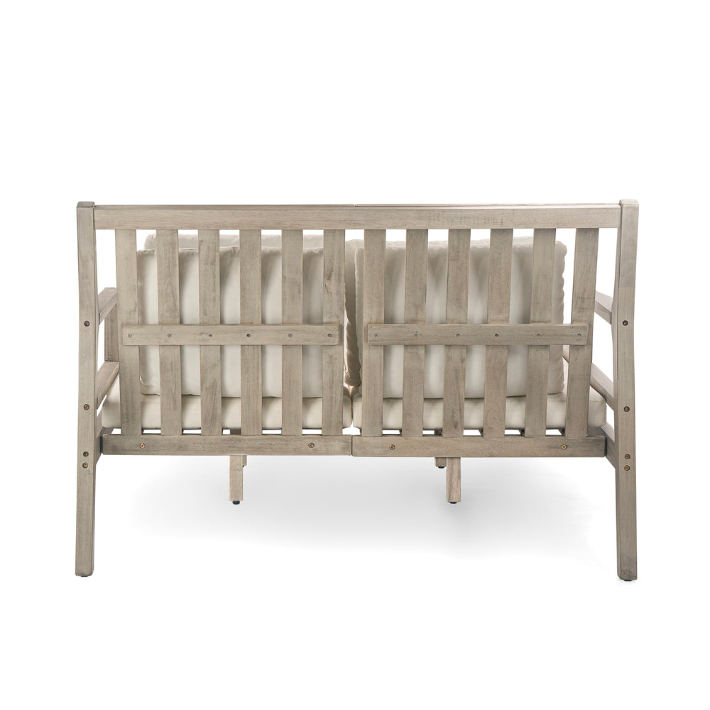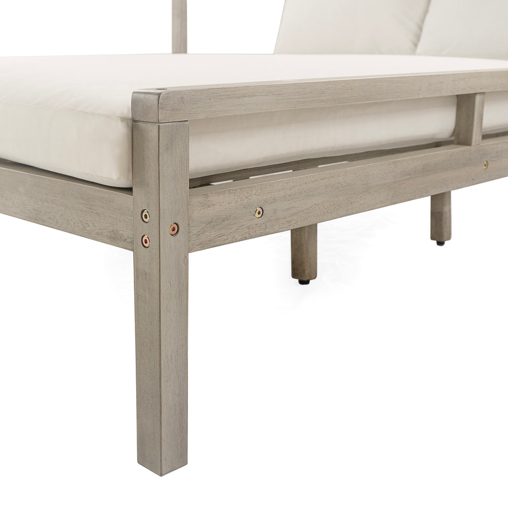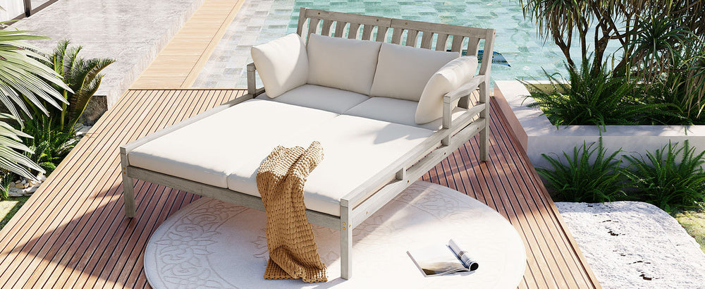 Omega Lifestyles outdoor daybed features a spacious acacia wood frame with ergonomic backrest, curved armrests, and four removable cushions for personalized comfort. Weather-resistant and durable, it supports two people, ideal for relaxing in the garden, patio, or poolside.