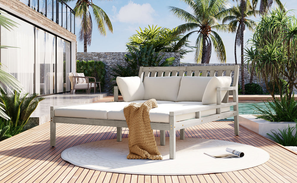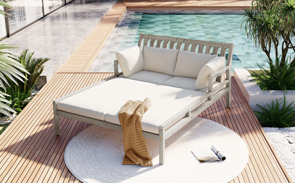 Acacia Wood Outdoor Daybed With Cushions And Pillows is backordered and will ship as soon as it is back in stock.