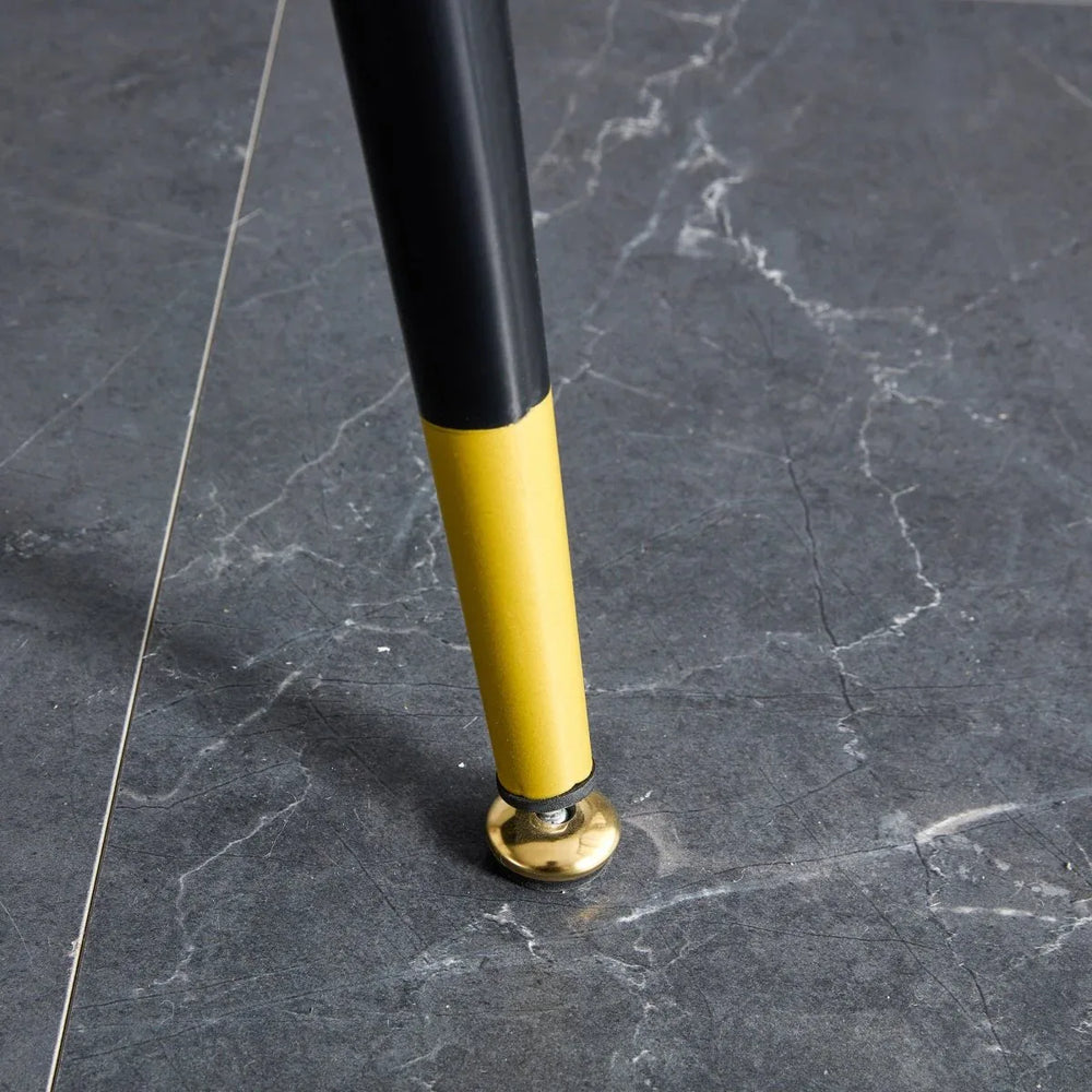 Enhance your dining space with this modern table and chair set featuring a durable sintered stone tabletop and sleek black metal legs. The set includes one spacious table and four chairs, each with a soft padded seat and dual-color orange-yellow and gray PU leather backrests that offer both comfort and vibrant style. Perfect for family meals, casual gatherings, or afternoon teas, this set brings warmth and functionality to any room. Easy to assemble with included tools and instructions, it’s designed to fit seamlessly in your home while standing up to everyday use. Make every meal a special occasion and elevate your relaxation today.