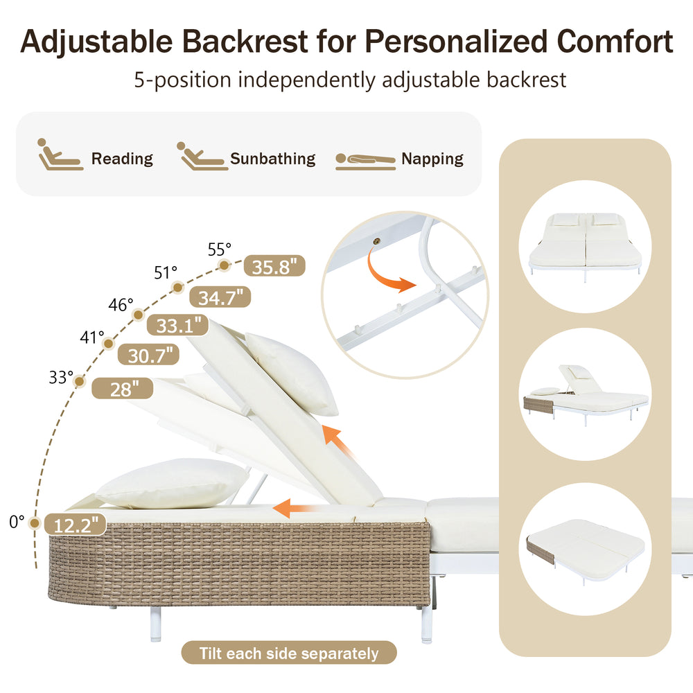 TREXM outdoor daybed features a durable iron frame with handwoven PE rattan and a sleek curved design. Dual 5-position adjustable backrests and removable, weather-resistant cushions offer personalized comfort for two, ideal for patios, gardens, poolside relaxation.