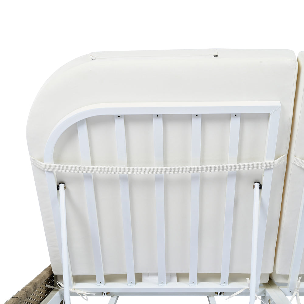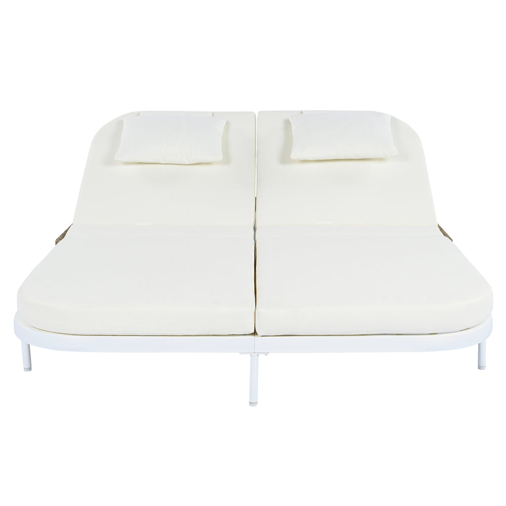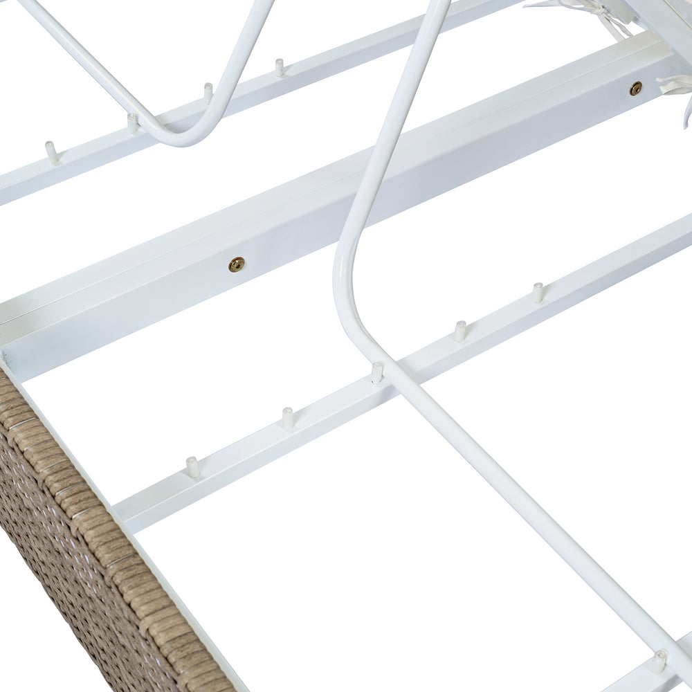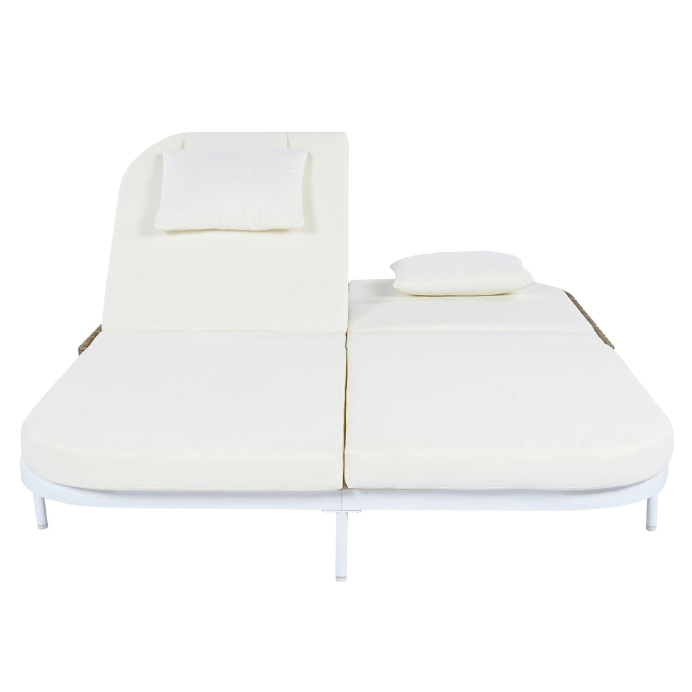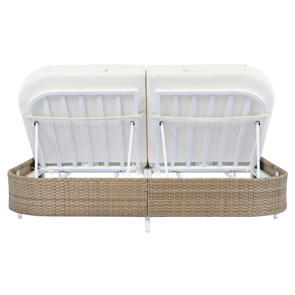 Unwind in style with this spacious outdoor daybed, designed for two to relax side by side. Featuring independently adjustable 5-position backrests, each side can be tilted to your preferred angle for sunbathing, reading, or napping. The durable iron frame combined with handwoven PE rattan offers lasting strength and weather resistance, while the beige cushions and pillows add plush comfort. Thick, removable cushions with high-density foam provide support that resists sagging, and their washable covers make maintenance effortless. With a sturdy frame and adjustable feet, this daybed ensures stability even on uneven surfaces, making it perfect for your garden, patio, or poolside. Elevate your outdoor living space today with this stylish and functional loveseat daybed.