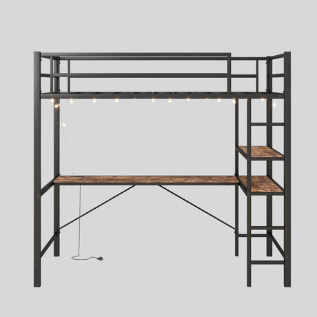 Twin Metal Loft Bed Frame With L-Shaped Desk And Charging