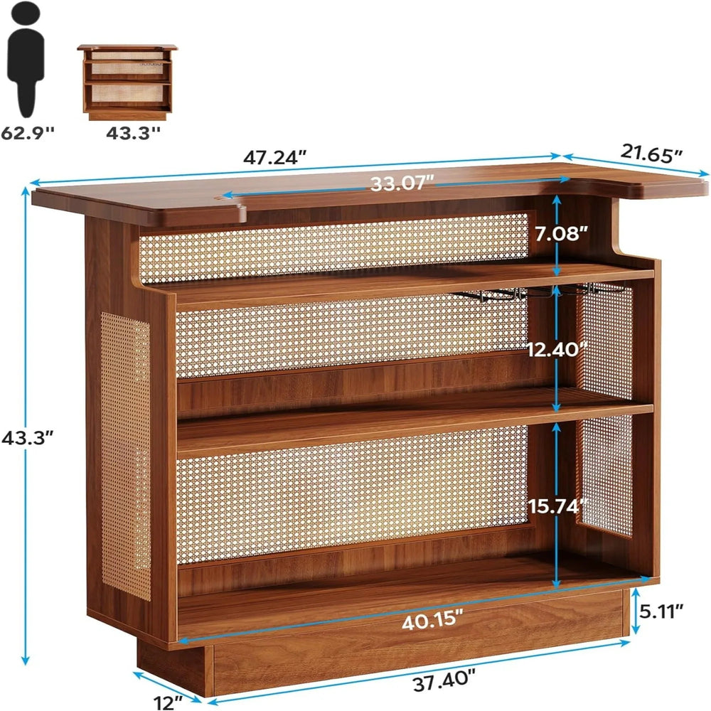 Bring rustic charm and professional functionality to your living space with this 47.24-inch caramel brown farmhouse rattan home bar unit. Crafted from warm wood and intricately woven rattan, this 4-tier liquor cabinet combines boho-chic style with practical storage for bottles, wine, and stemware. The spacious U-shaped countertop offers an ideal surface for mixing cocktails, while adjustable shelves and dedicated wine racks keep your collection organized and accessible. Hand-woven rattan panels enhance airflow, helping maintain optimal storage conditions. Standing 43.31 inches tall on a sturdy 5.1-inch base, this compact yet durable piece fits perfectly in living rooms, dining areas, or apartments. Quick to assemble with clear instructions, it’s the perfect centerpiece for wine lovers and cocktail enthusiasts alike. Elevate your relaxation and entertaining experience today.