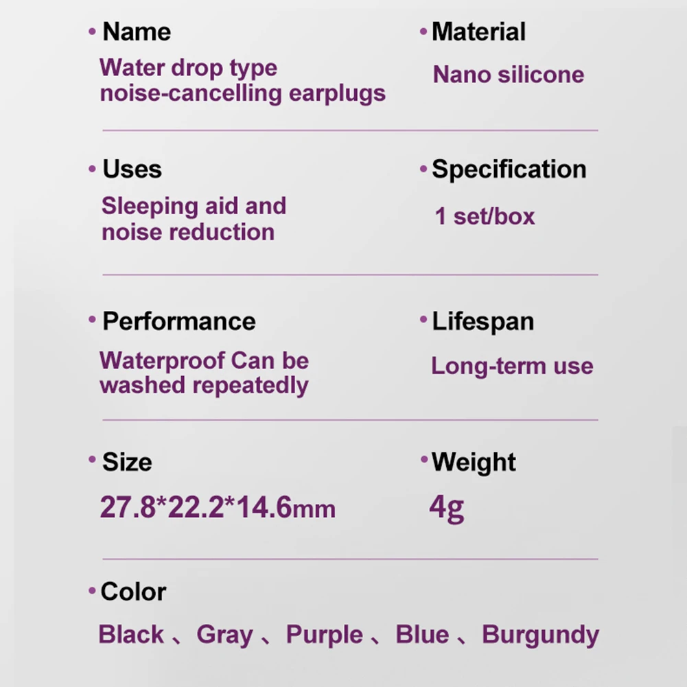 Feature: 1. Innovative Design: The earplugs feature a unique spliced water droplet-shaped filter that delivers superior sound attenuation, enabling you to enjoy quiet and peaceful surroundings. 2. Customize your Style: Choose from 5 different colors and mix and match to create your unique style. 3. Unmatched Noise Reduction: The earplugs utilize physical noise reduction technology and advanced sonic filtering, effectively blocking out unwanted noise, making them good for use in noisy environments. 4. Comfortable Fit: The earplugs are designed to fit seamlessly into the ear, providing a comfortable and secure fit that stays in place when sleeping or moving around. 5. Easy to Clean and Store: Made from environmentally friendly silicone material, the earplugs are easy to clean and can be reused multiple times. The three different sizes of ear tips ensure they fit all ear shapes and sizes, and there is a convenient storage box included for storing them when not in use. Specification: Certification: CE Origin: Mainland China Material: Nano silicone Colors: Black, Gray, Purple, Burgundy, Blue (optional) Performance: Waterproof and washable repeatedly Life: Long term use Size: About 27.8 * 22.2 * 14.6mm/1.09 * 0.87 * 0.57inch Weight: 4g