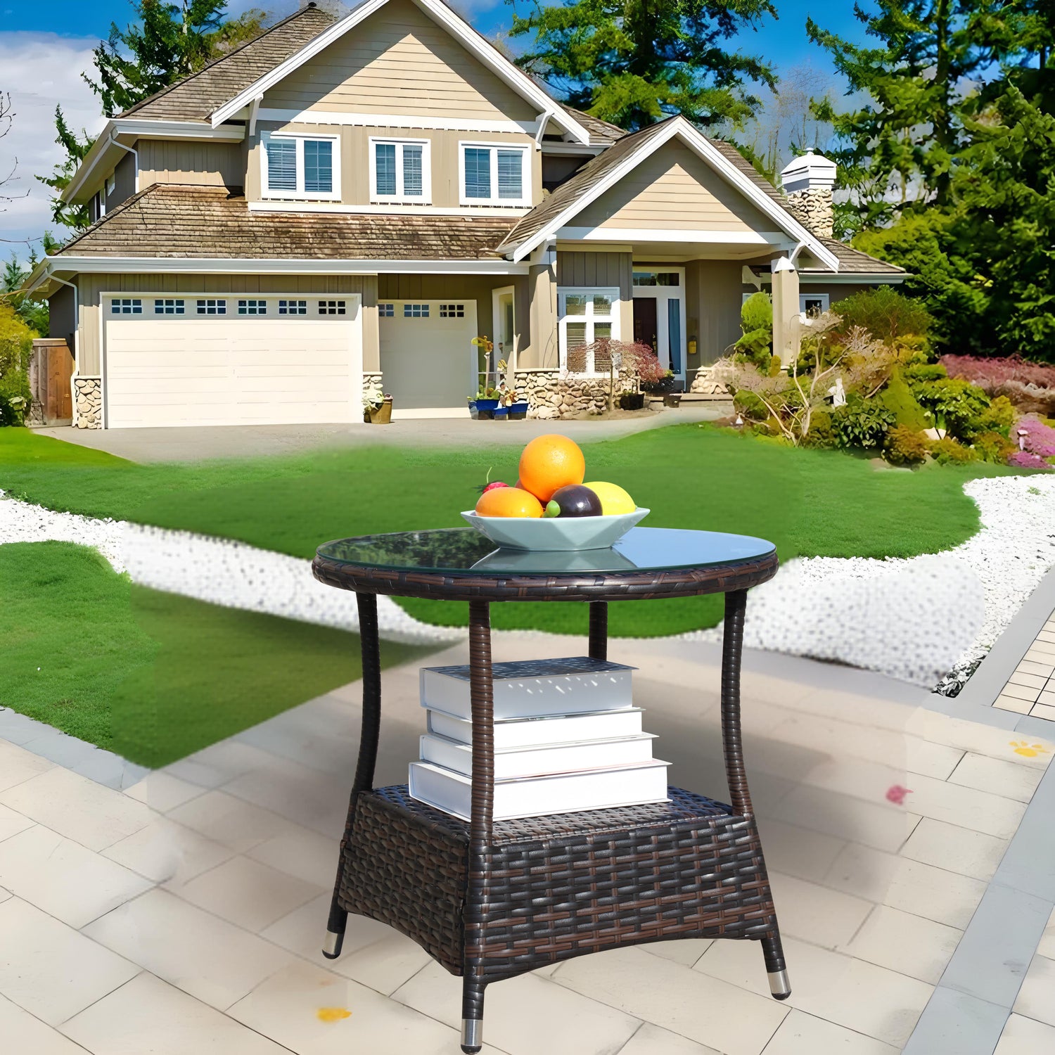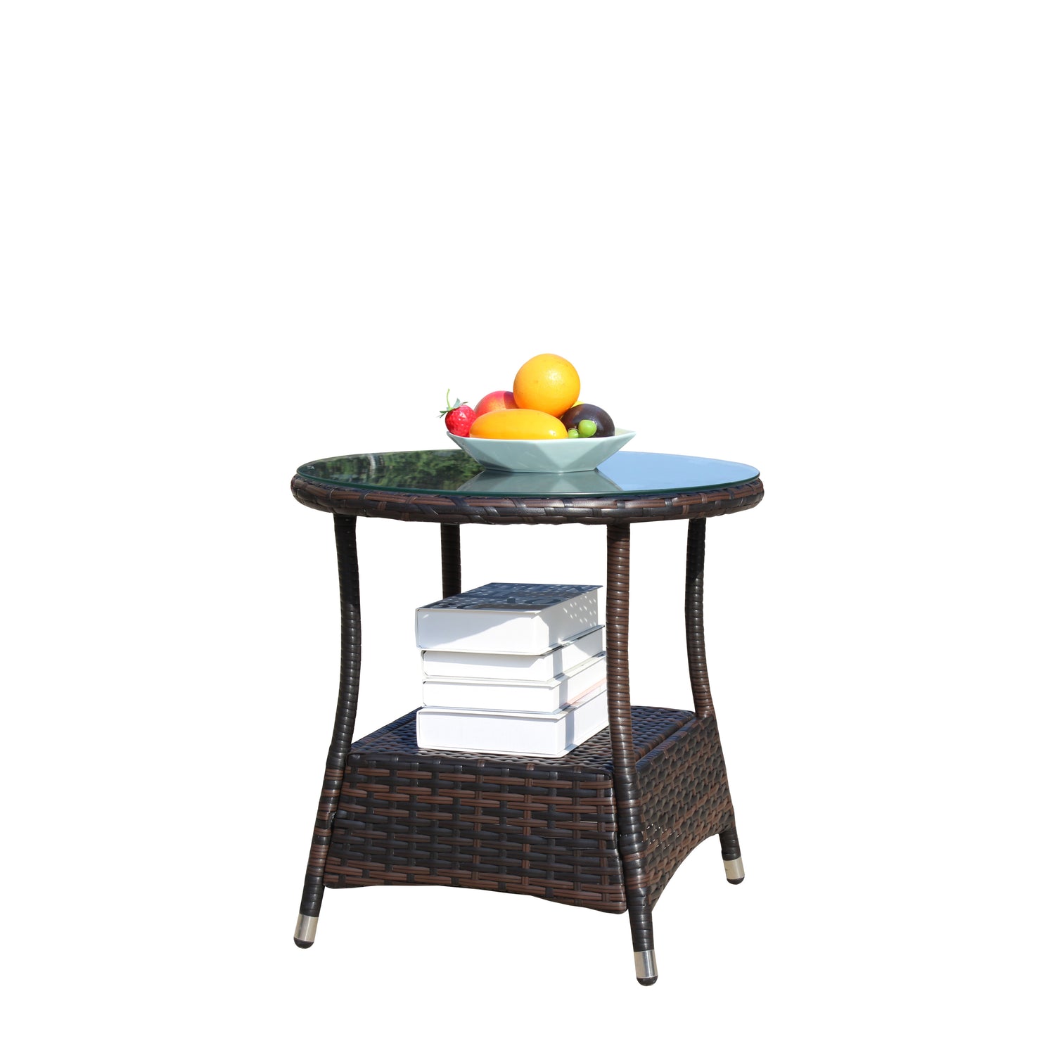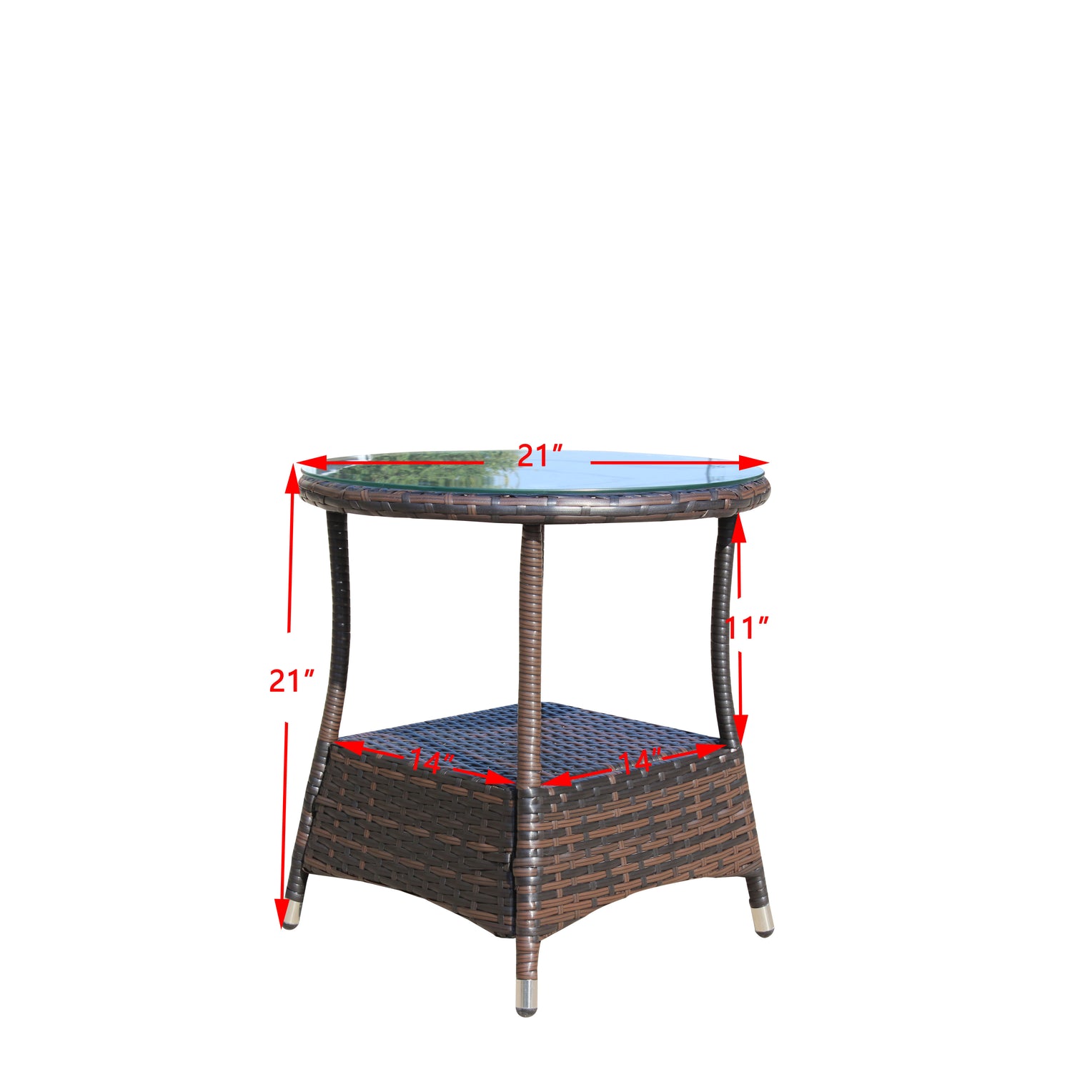 Crafted for both function and flair, this 21-inch (53 cm) round coffee table brings a refreshing update to your patio or garden seating area. The durable PE rattan frame weaves a natural brown wicker aesthetic that complements any outdoor décor, while the sturdy iron structure ensures lasting stability. Topped with a 0.2-inch (5 mm) thick clear tempered glass surface, it provides a sleek, easy-to-clean tabletop perfect for drinks, snacks, or decorative accents. Designed to withstand outdoor elements, its water-resistant and UV-resistant materials help maintain beauty even under sun and rain exposure. Assembly is quick and straightforward with all necessary tools included. Whether you’re hosting friends or enjoying a quiet moment, this compact table adds charm and convenience. Elevate your outdoor relaxation experience today.