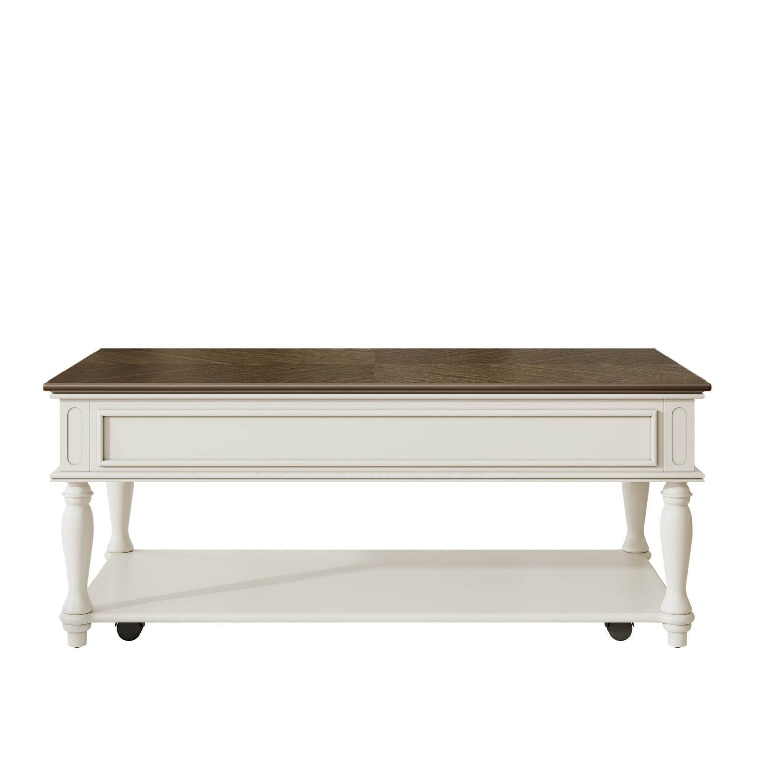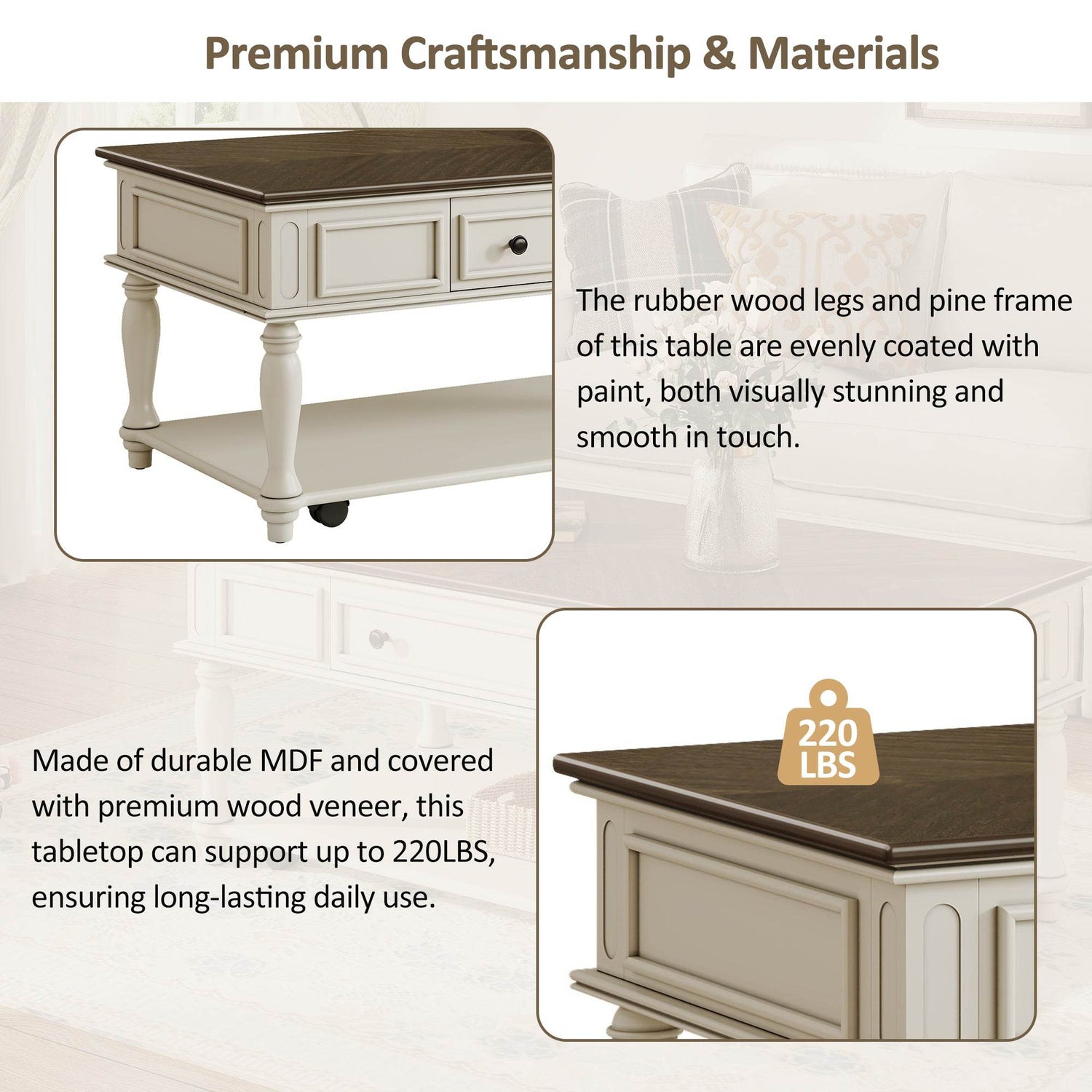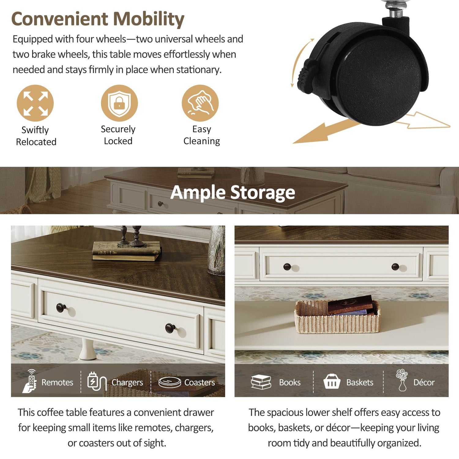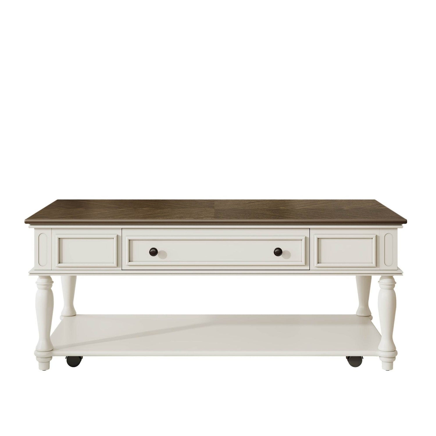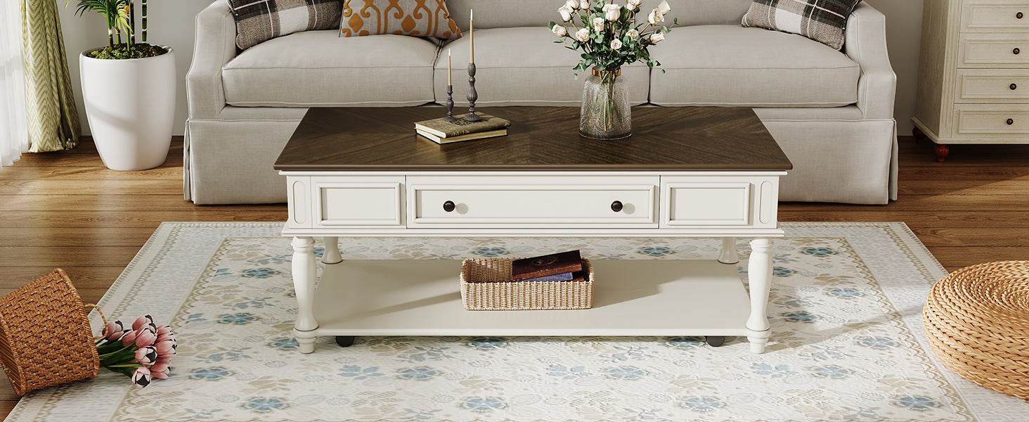 Bring classic charm and functional design to your space with this farmhouse coffee table featuring a retro mid-century style. Crafted from solid wood and durable MDF with a smooth grey veneer top and white-painted rubber wood legs, it adds both warmth and elegance to any living room. The rectangular tabletop offers ample space for your décor or beverages, while a spacious drawer and lower shelf provide convenient storage for remotes, magazines, and more. Equipped with lockable wheels, this movable cocktail table lets you effortlessly rearrange your room or clean beneath it. Designed for quick, easy assembly, this coffee table is the perfect blend of style and practicality to elevate your relaxation and organization. Upgrade your living space today.