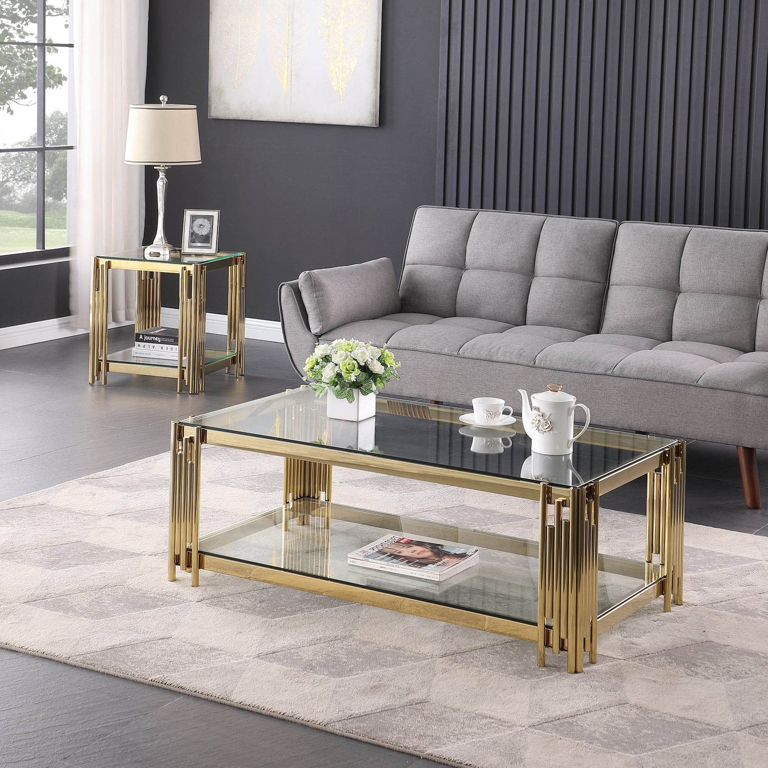 Rectangular gold stainless steel coffee table features a tempered glass top with two shelves, offering durable, easy-to-clean surfaces and an industrial chic look. Measuring 48"L x 26"W x 17.5"H, it fits living rooms seeking modern style and functionality.