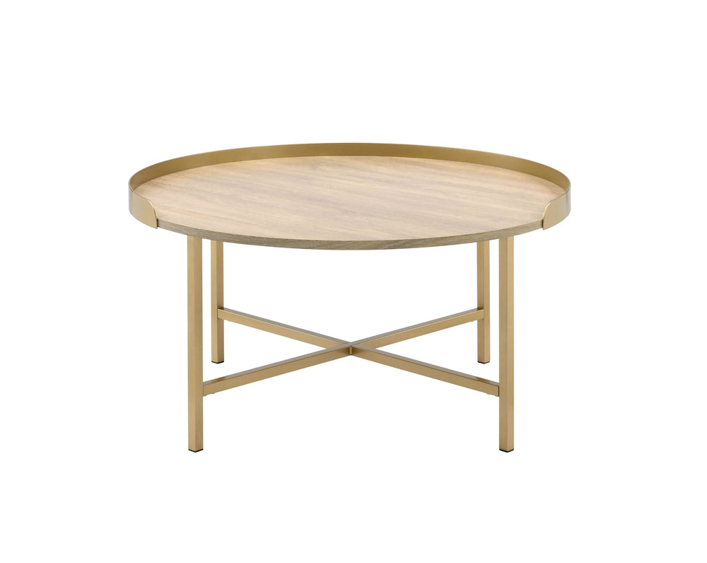 Contemporary coffee table features a round tray-style top with a sturdy cross bar metal base in gold and oak finishes, combining strength and style for living room use. Crafted from wood, MDF, and metal for lasting durability and timeless appeal.