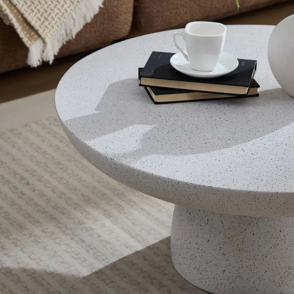 Bring a blend of modern artistry and functional design to your home with this unique round coffee table. Crafted from high-quality fiberglass, its smooth polished surface mimics natural stone with a beautiful beige and gray weathered finish. The mushroom-inspired shape features a wide, flat tabletop supported by a sturdy rounded pedestal base, making it perfect for holding your morning coffee, books, or decorative accents. Measuring 31.5 inches in diameter and standing 14.17 inches tall, this lightweight yet durable piece fits seamlessly into modern minimalist lounges, cozy reading nooks, or stylish home offices. Its freestanding design with open storage encourages easy access and versatility, creating a chic focal point in any primary living space. Transform your environment with this artistic coffee table—elevate your relaxation and style today.
