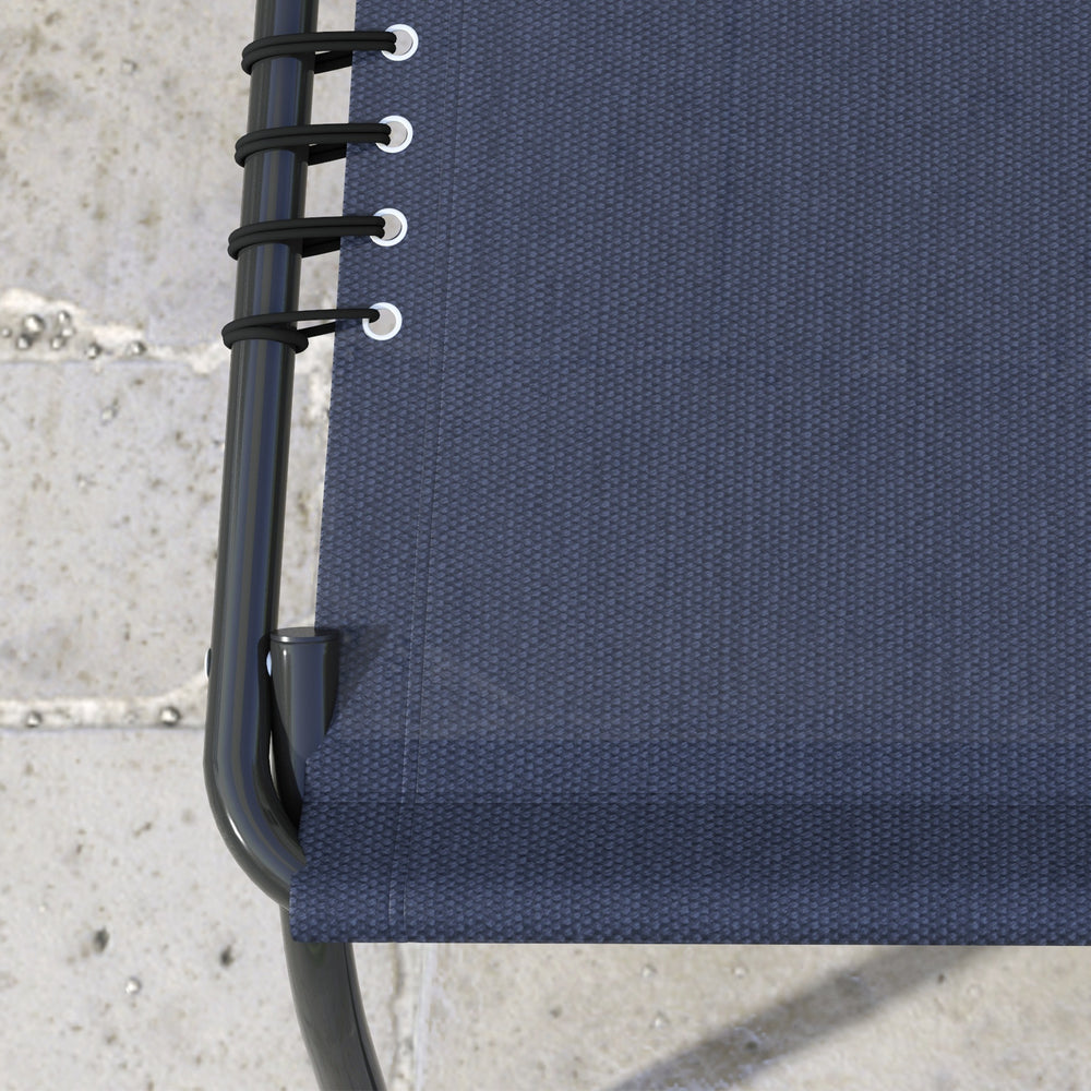 Unwind under the sun with this versatile set of two foldable outdoor chaise lounges, perfect for poolside, beach days, patios, or camping trips. Featuring breathable bungee seats with mesh fabric, these loungers offer comfortable support that contours to your body while keeping you cool and dry. Adjustable backrests with four reclining positions and padded pillows let you find your ideal lounging angle, whether sunbathing, reading, or napping. Crafted with durable steel frames and a weather-resistant powder coating, these lightweight chairs easily fold for compact storage and effortless portability. Enjoy premium outdoor relaxation anywhere with this attractive dark blue lounge set designed for comfort and convenience. Elevate your outdoor living space today.