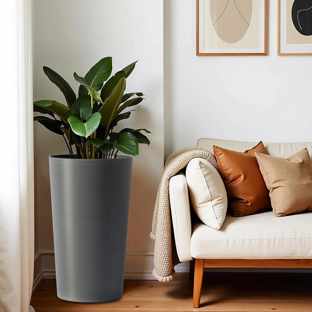Durable polypropylene planters with a 21.7-inch height support medium to large plant root growth. Weather-resistant, shatterproof, UV- and crack-resistant, these modern grey planters suit indoor and outdoor gardening, balcony decor, and home landscaping needs.